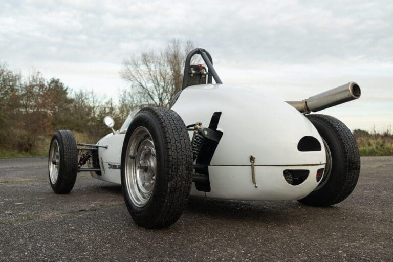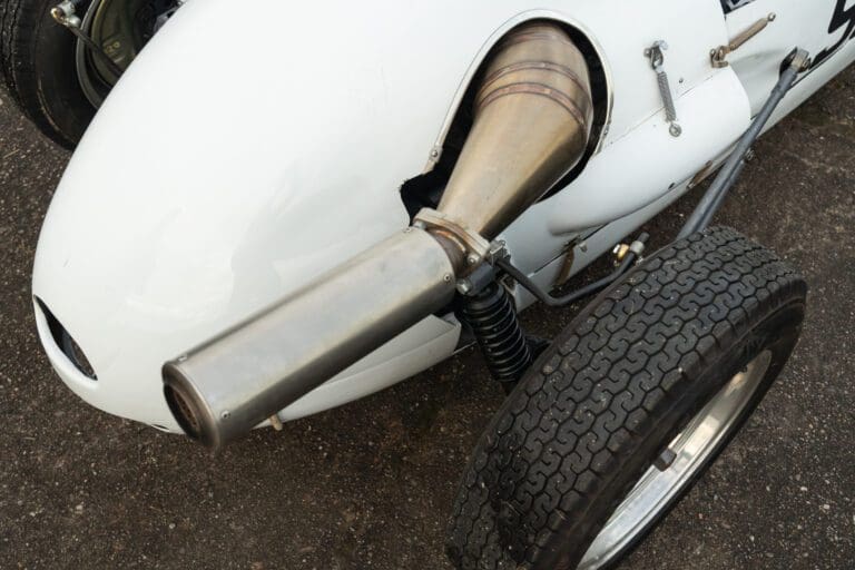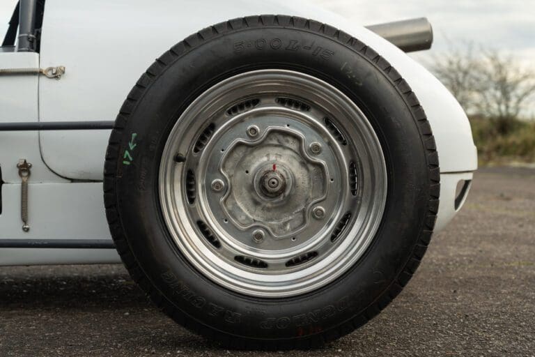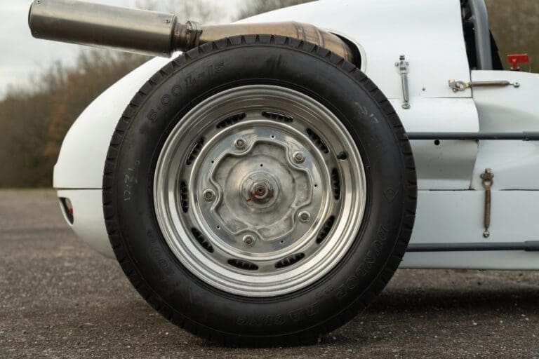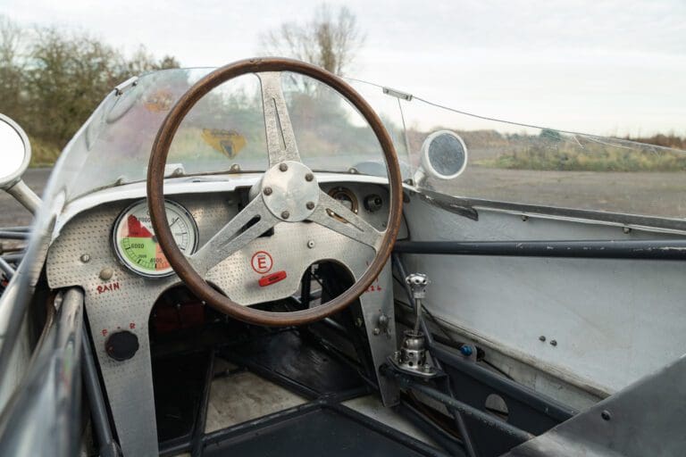The PBA II features a DKW engine, gearbox, steering rack and track rods, brakes from very early VW Transporter T1, Porsche 356 wheels, modified DKW/Goggomobil combination driveshafts, bespoke hubs and uprights, motorcycle springs and dampers, a twin wishbone front suspension and low pivot-point swing axle to the rear. Interestingly the dashboard is stressed and made of alloy and wood laminate.