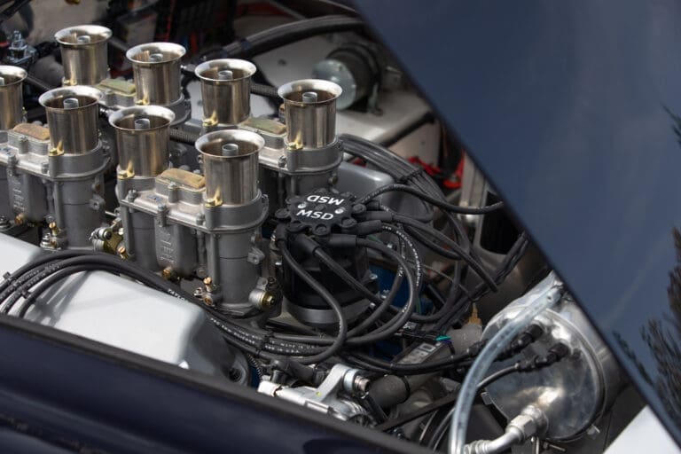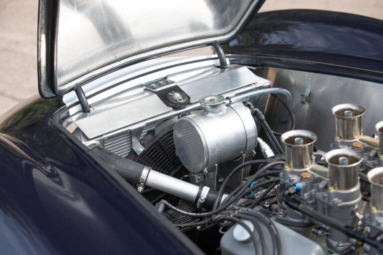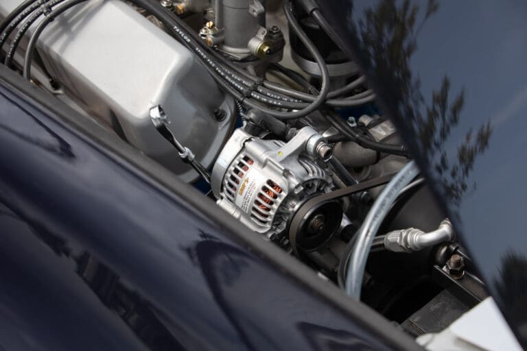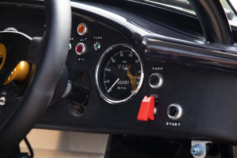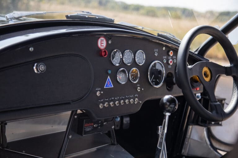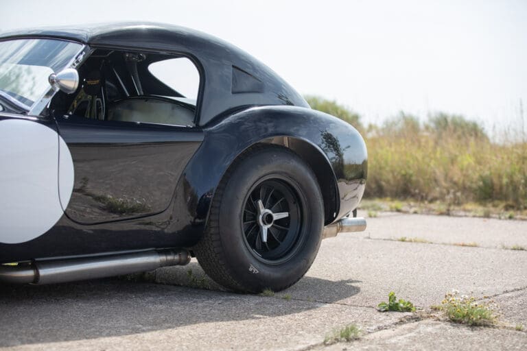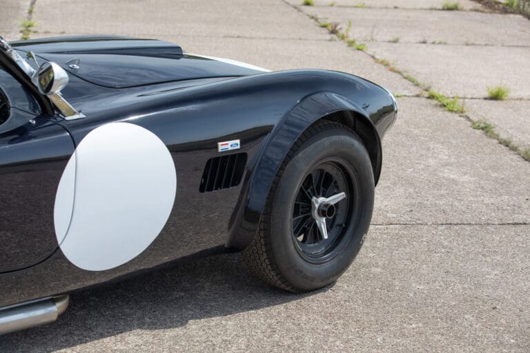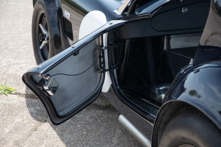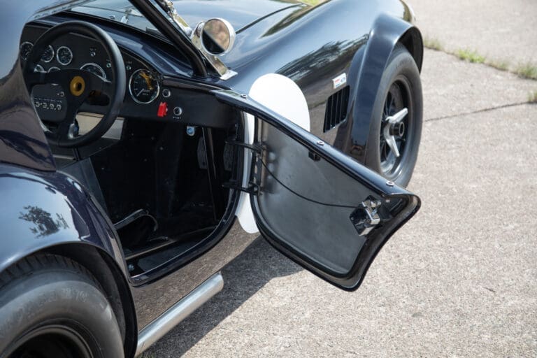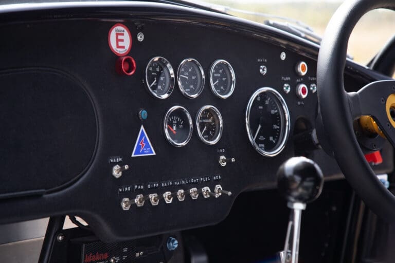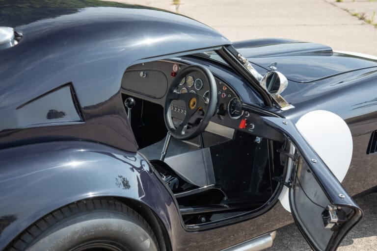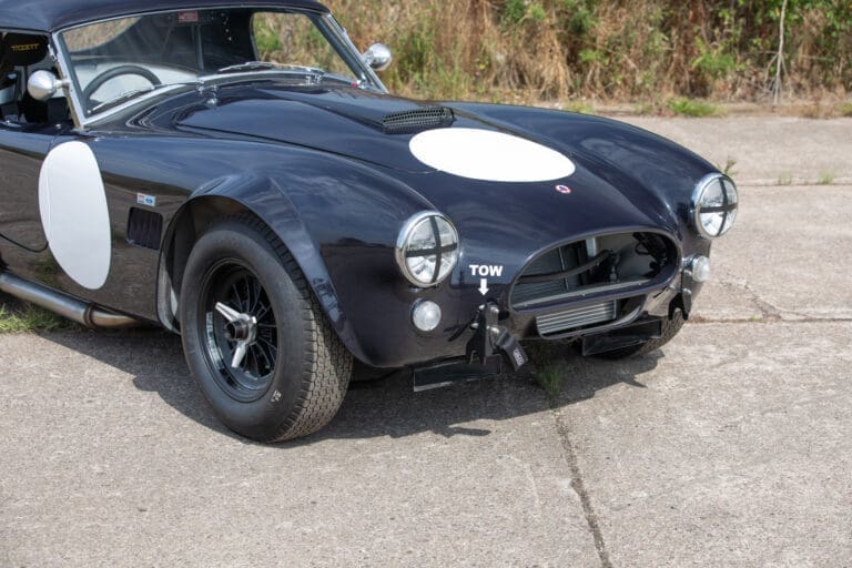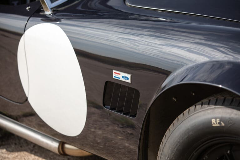 Built between 2021 and 2024 by a well-known Cobra racer on a no-expense-spared basis, this car utilises the best quality components available, ensuring both period accuracy and competitive performance. The chassis and body were supplied by Gerry Hawkridge (Hawk cars) and the aluminium coachwork has been finished in dark blue by Anson Clarke of Tetworth – all fabrication work was carried out by RW Racing and Eugene Farrell (ex Prodrive). The Cobra is correctly fitted with a period-correct, all new FIA sealed engine by Peter Knight (460bhp/395ft-lb). The Ford 289ci is fitted with MDS 6AL ignition (also wired for points) and has Peter Knight manifolds / exhausts with an RW Racing-developed stainless steel (re-packable) system. A Jim Inglese throttle linkage and KRS lightweight clutch were also incorporated into the build and the Ford motor is mated to a Rolltek T10 gearbox, with ’S’ ratios and a rose-jointed Hurst shifter (again built by RW Racing). Power is transmitted to the circuit via a gripper differential (3.2 ratio) and Hawk heavy-duty race prop shafts, plus engine and diff mounts. The Cobra rides on Koni 8211 shock absorbers and is fitted with coil springs by Brost Forge / RW. The anti roll bars are also RW-supplied units and stopping is aided via Girling ORA/CRA callipers with Tilton Master Cylinders and pedal box bias adjustment. The magnesium wheels and aluminium spinners were manufactured by Crosthwaite & Gardiner and are shod with period-correct FIA legal Dunlop L-section tyres. The car is fitted with a bespoke welded T45 roll cage by Custom Fabrications and the 165-litre safety bladder tank was supplied by Premier Fuel Systems. A lightweight Tillet B6 ‘Screamer’ seat is fitted to the cockpit, along with a Lifeline Zero 360 lightweight electric fire extinguisher system and Cartek GT Battery safety cut-out.