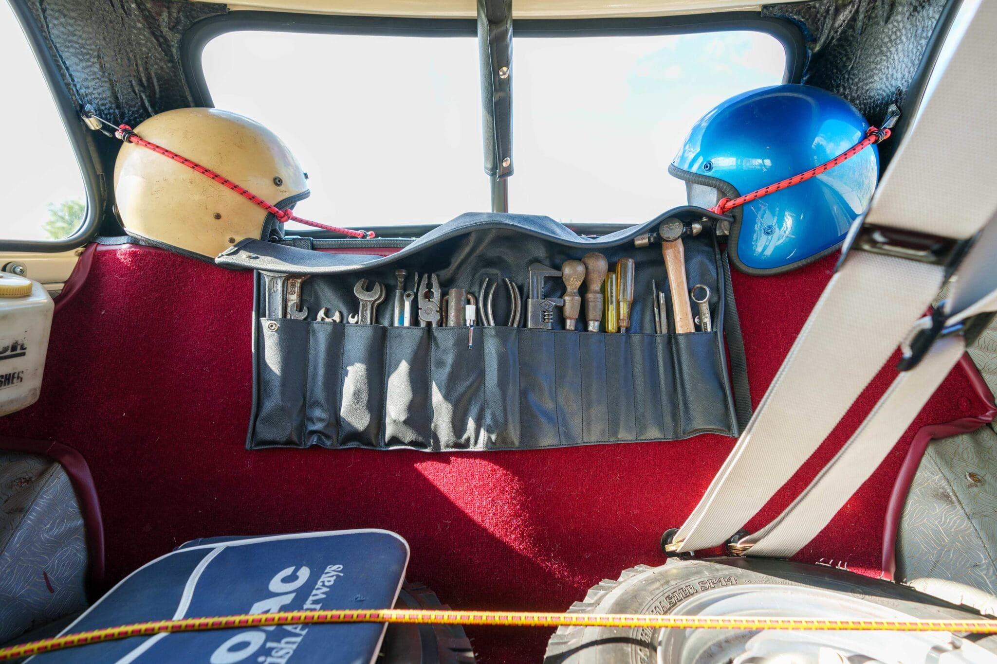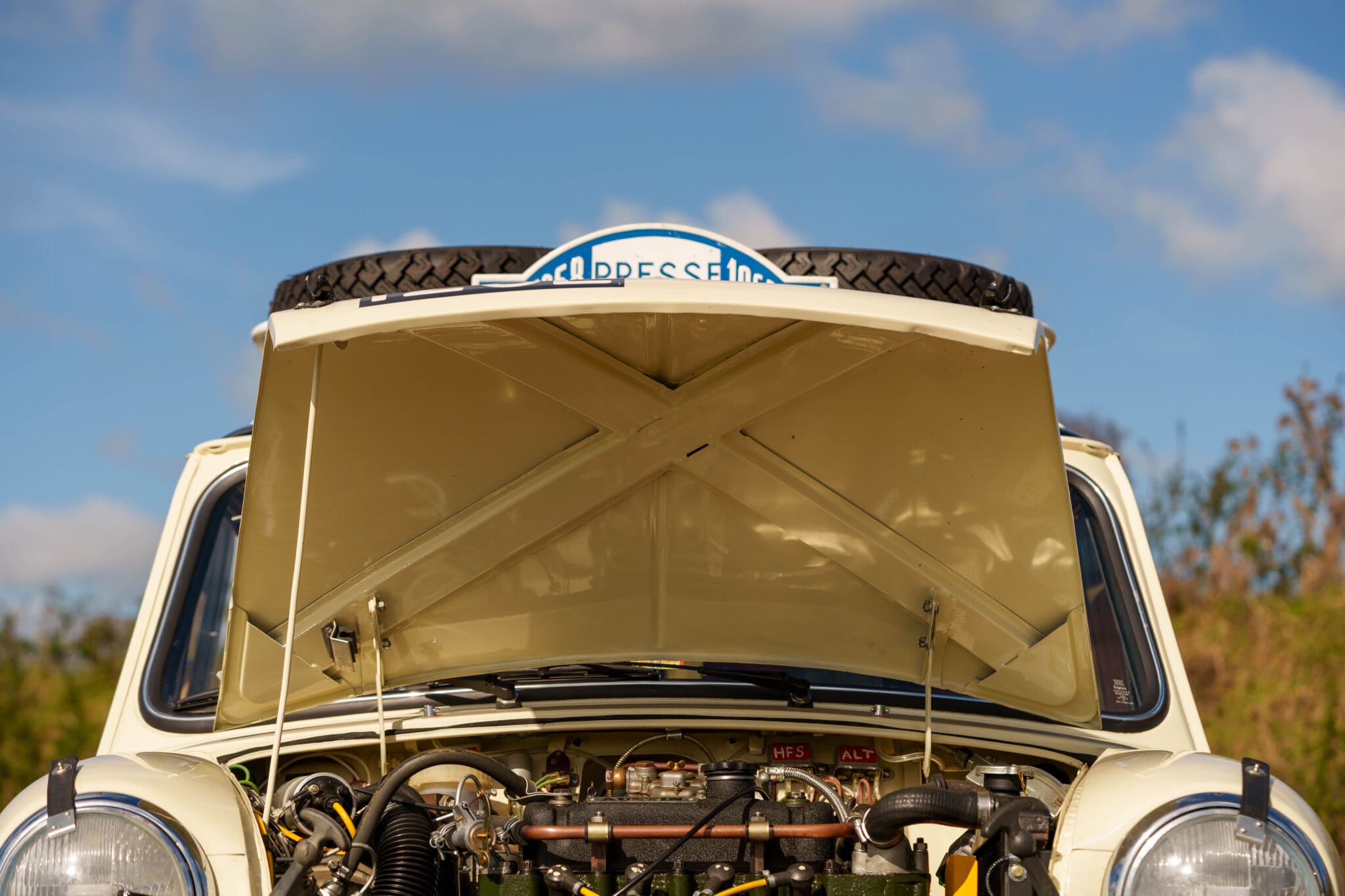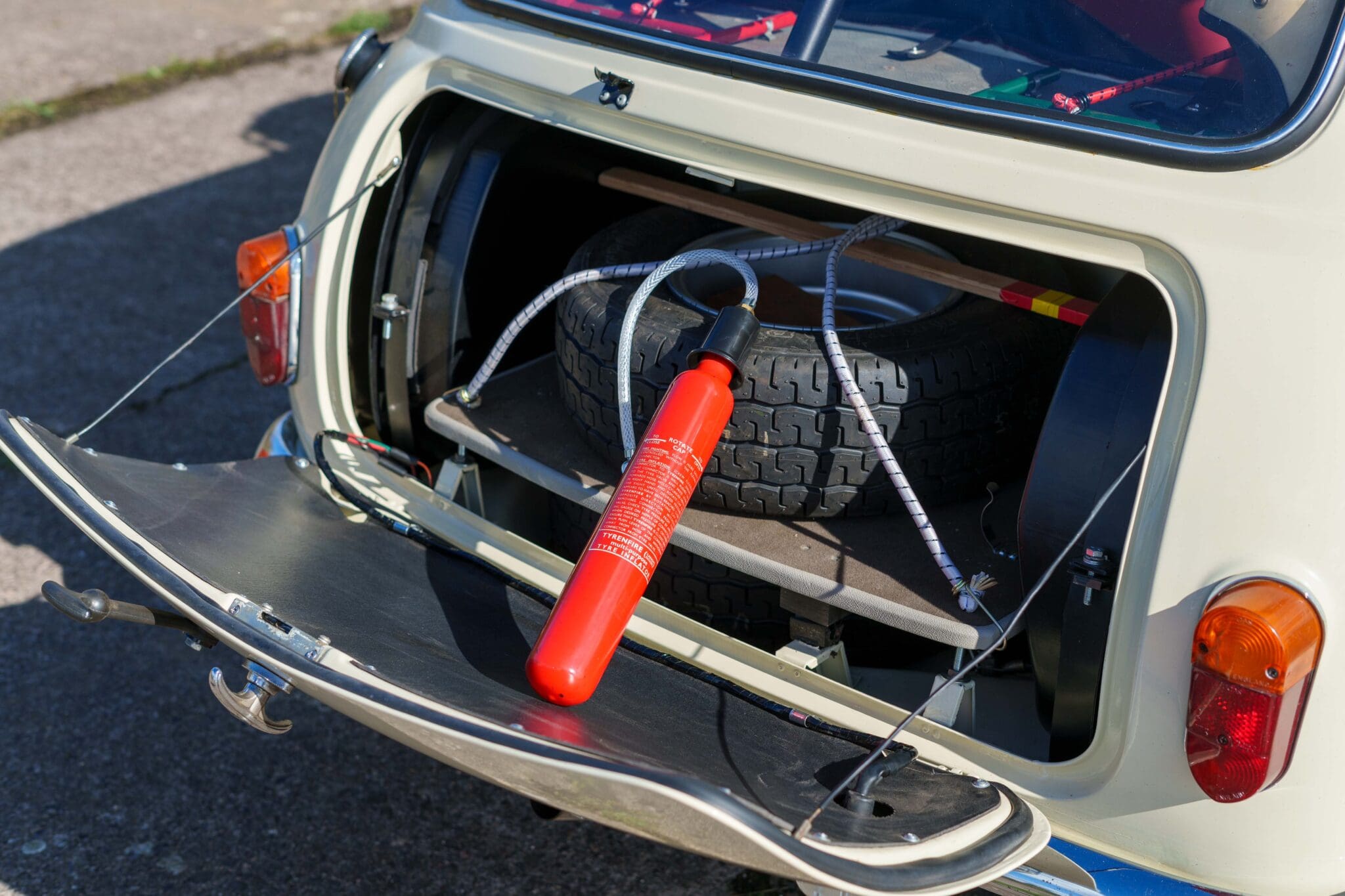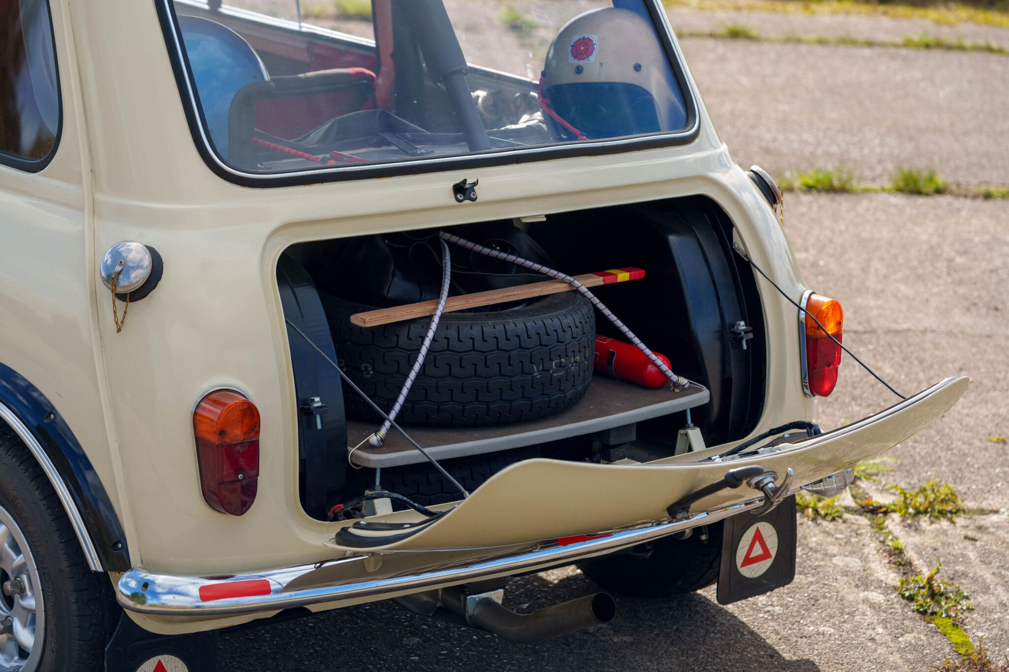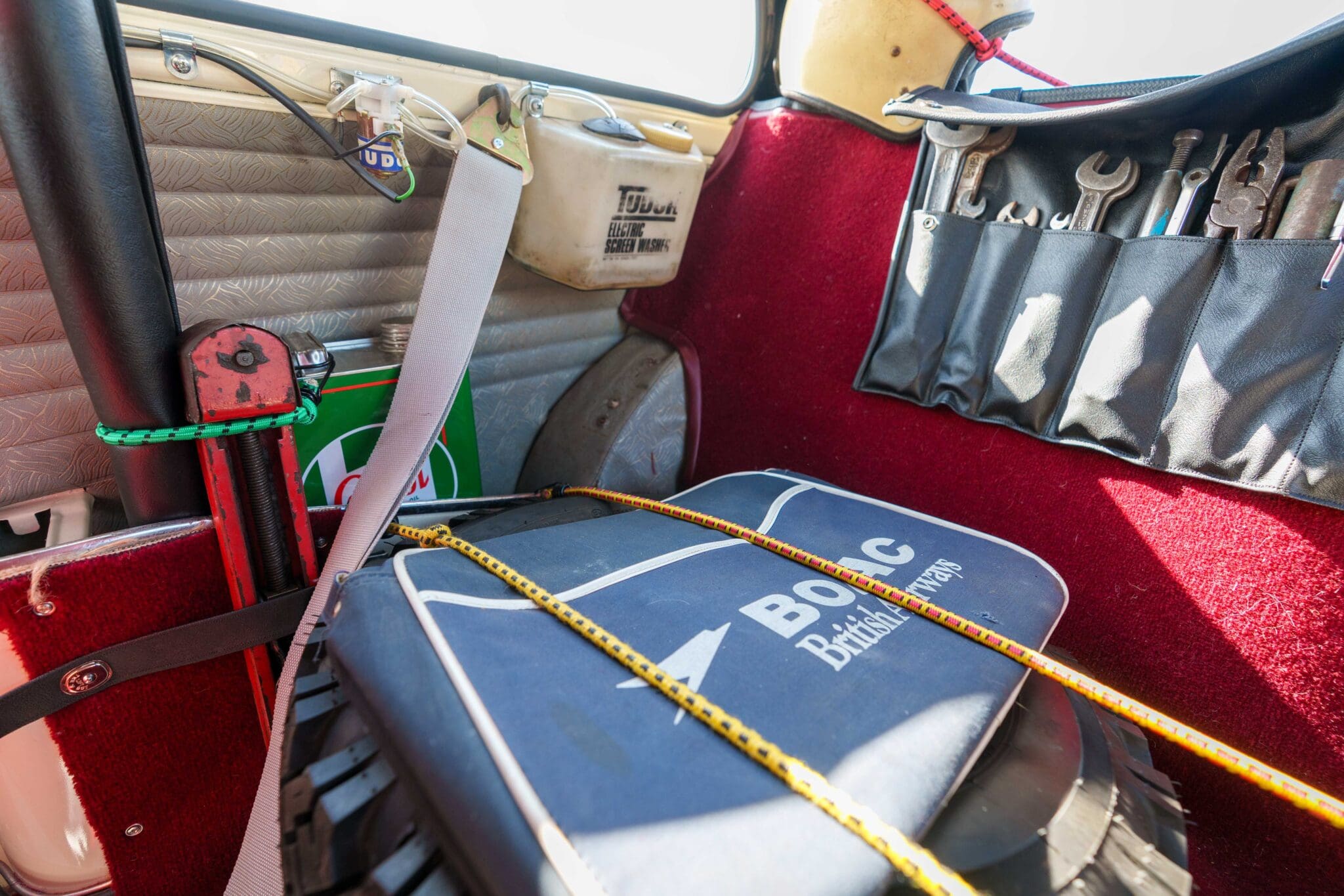 All of the “Works skidded” subframes were rebuilt and the hydrolastic interconnecting pipework remade to fit back inside the car, alongside battery, brake and wiring. This was done in the day to avoid any damage from under the car. The super rare Scandinavian sump guard is fitted (with inner collar). The car was re-wired using the original Lucas braided cables, mated to the fabulous works dashes. The car had all fuel pipes covered going through the back seat to the tanks, so that two studded tyres could be locked in place. The rear parcel shelf has the John Aley 3 point cage attached with two different wheel braces, one to fit Minilite wheels the other the standard mini nut. Ironically painted Red and Green (port and starboard perhaps???!). Spare nuts are carried within the car for steel wheel fitment. The boot area carries two “road” Minilite wheels, with the boot board having to be modified in the day to fit the 165 tyre. Both tank straps are modified. Within this area are the tools carried within a BMC tool bag, with the correct super-slim spanners. This compliments the tool roll that hangs from the bag shelf with further tools if they have problems. The super rare Elopress tyre/fire is located on the board. There is the correct modified jack that sits attached to the OSR pocket held in with a lovely strap for quick release. A later addition to the car is a works style roof rack with modified quick release clamps to ease those two Dunlop SP 44’s off! Seats – These are the correct type drivers and navigators’ seats with the strengthened brackets to hold them in place. They have the correct Irvin belts that can be modified for all driver sizes. (Current owner is 6’2”!)