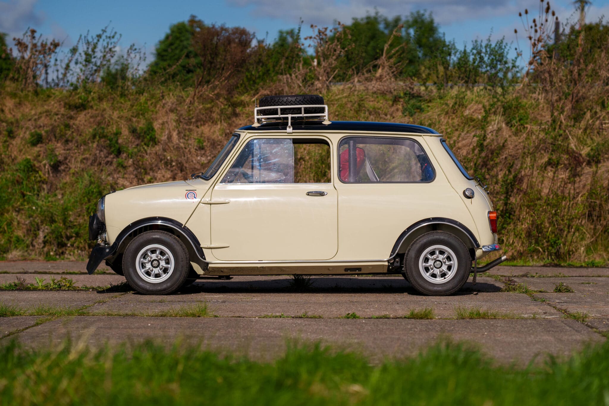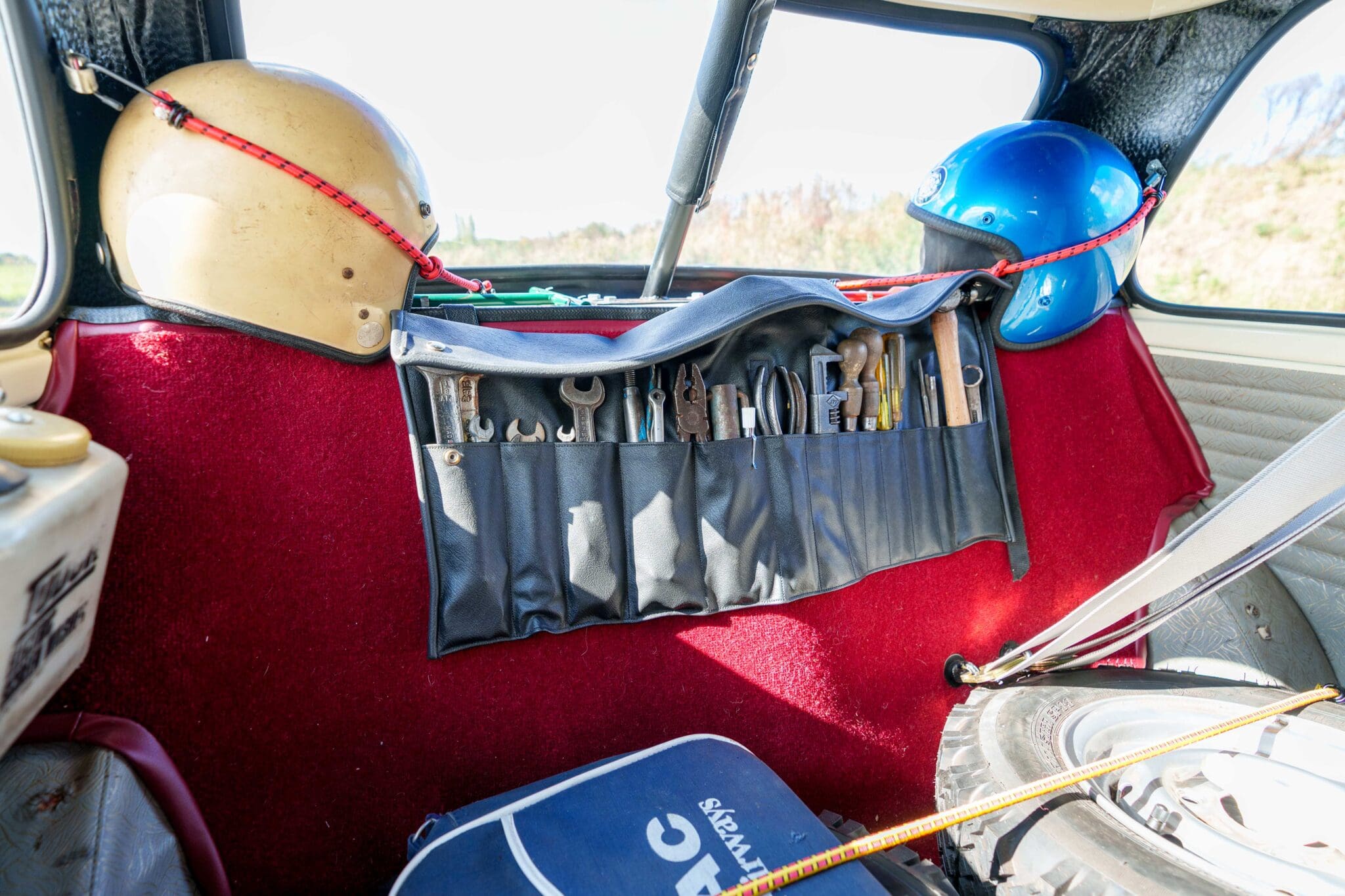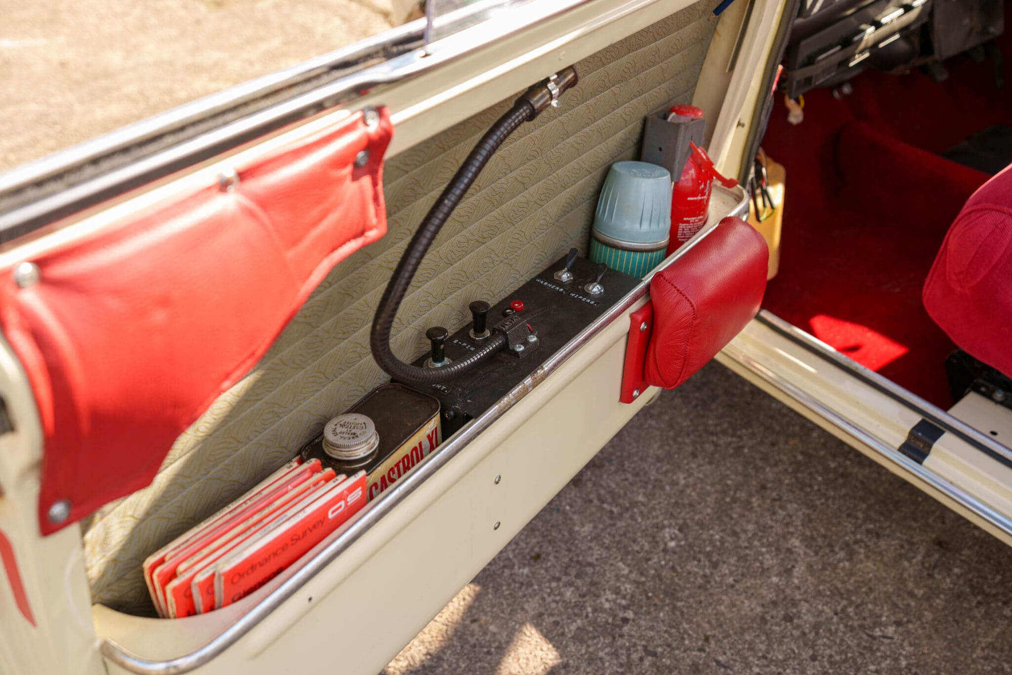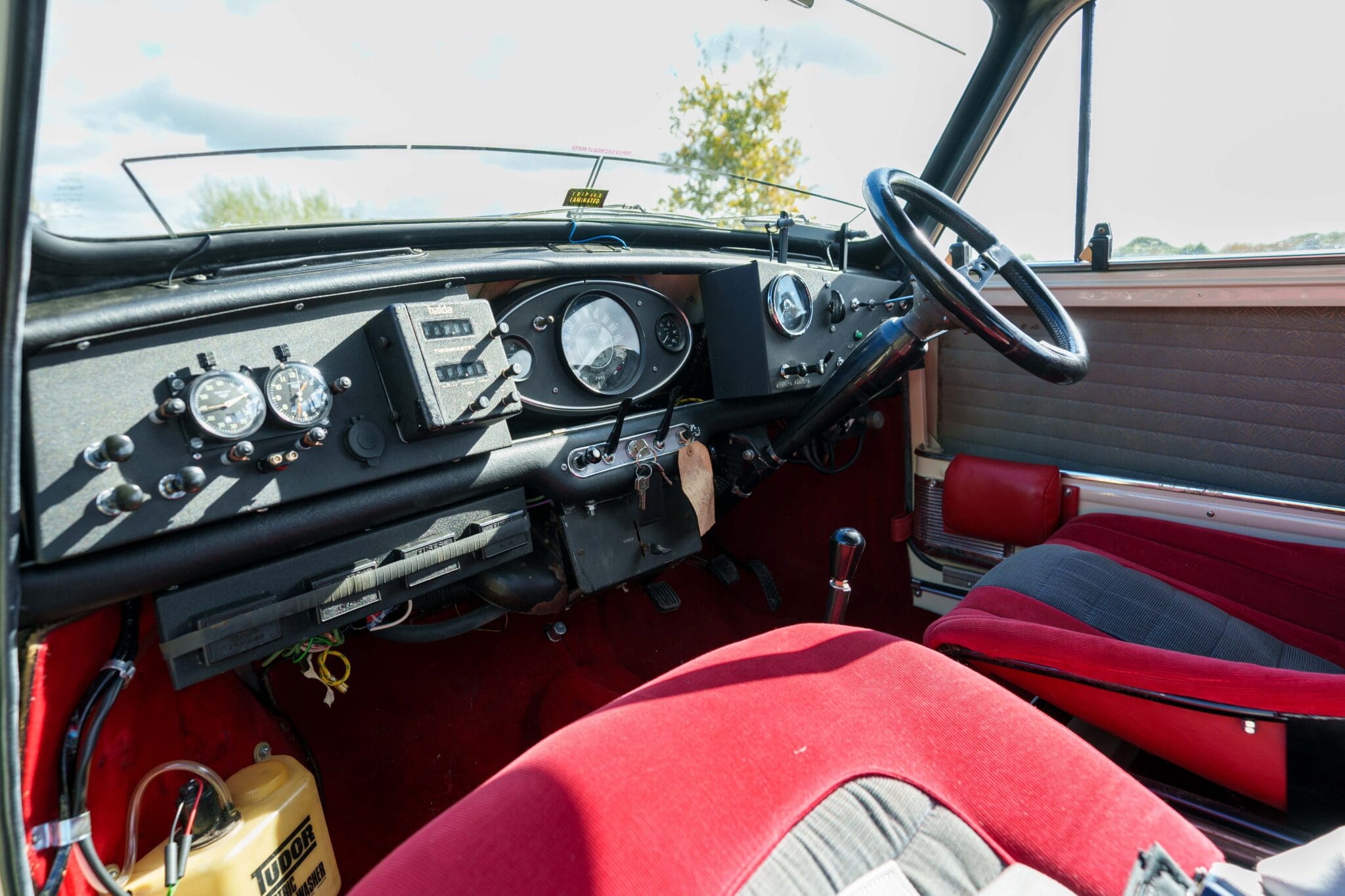 All of the “Works skidded” subframes were rebuilt and the hydrolastic interconnecting pipework remade to fit back inside the car, alongside battery, brake and wiring. This was done in the day to avoid any damage from under the car. The super rare Scandinavian sump guard is fitted (with inner collar). The car was re-wired using the original Lucas braided cables, mated to the fabulous works dashes. The car had all fuel pipes covered going through the back seat to the tanks, so that two studded tyres could be locked in place. The rear parcel shelf has the John Aley 3 point cage attached with two different wheel braces, one to fit Minilite wheels the other the standard mini nut. Ironically painted Red and Green (port and starboard perhaps???!). Spare nuts are carried within the car for steel wheel fitment. The boot area carries two “road” Minilite wheels, with the boot board having to be modified in the day to fit the 165 tyre. Both tank straps are modified. Within this area are the tools carried within a BMC tool bag, with the correct super-slim spanners. This compliments the tool roll that hangs from the bag shelf with further tools if they have problems. The super rare Elopress tyre/fire is located on the board. There is the correct modified jack that sits attached to the OSR pocket held in with a lovely strap for quick release. A later addition to the car is a works style roof rack with modified quick release clamps to ease those two Dunlop SP 44’s off! Seats – These are the correct type drivers and navigators’ seats with the strengthened brackets to hold them in place. They have the correct Irvin belts that can be modified for all driver sizes. (Current owner is 6’2”!)