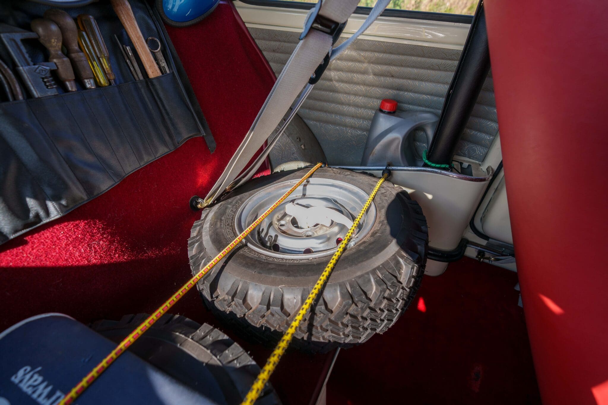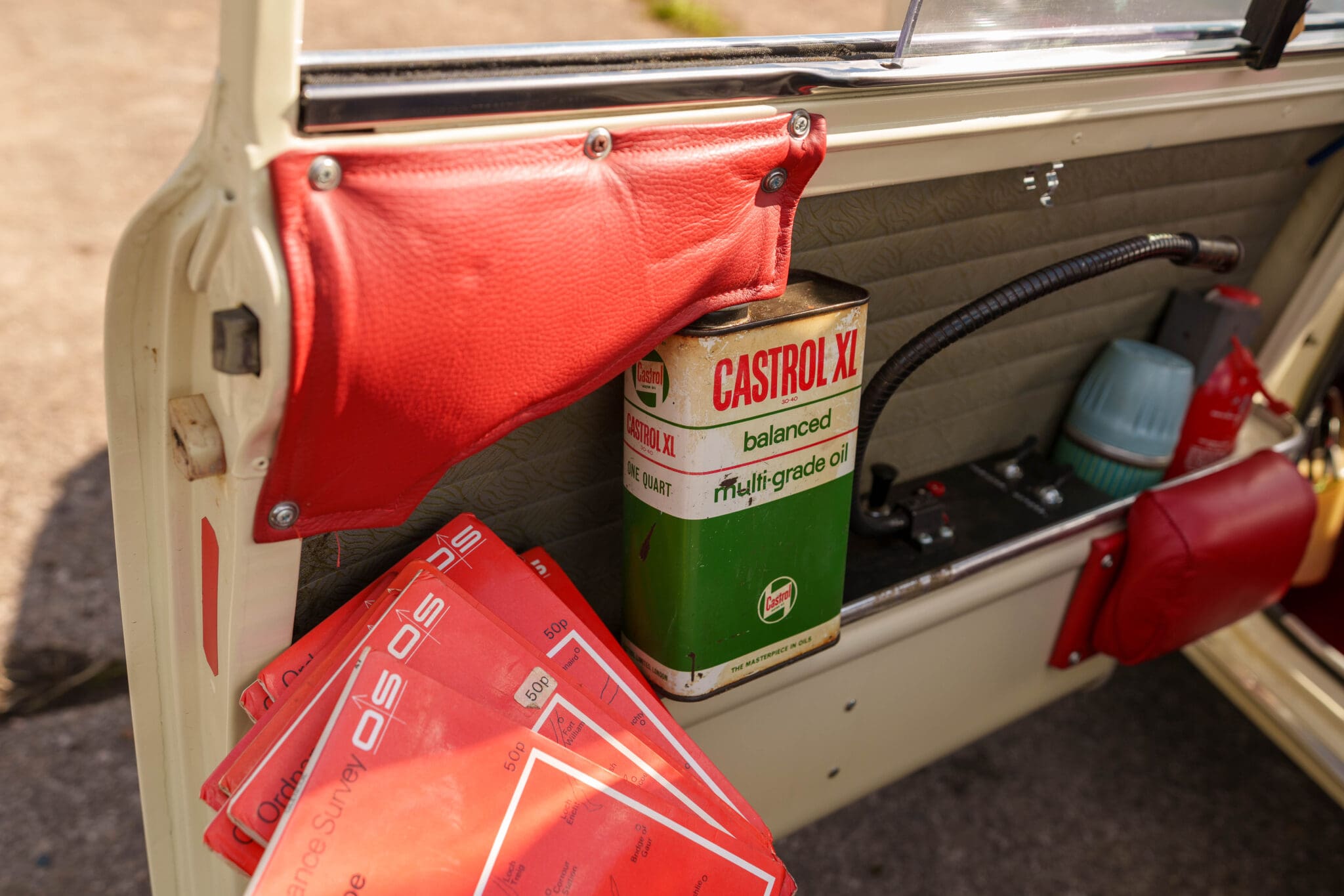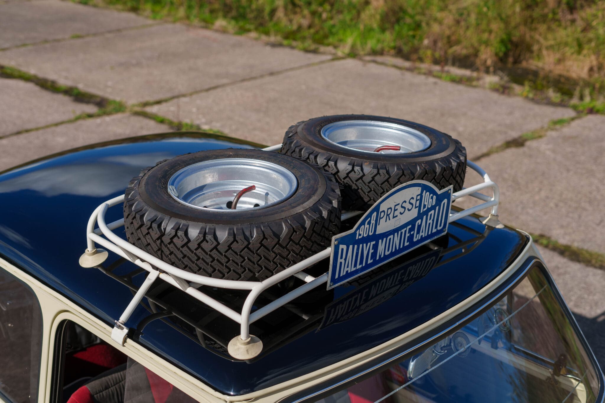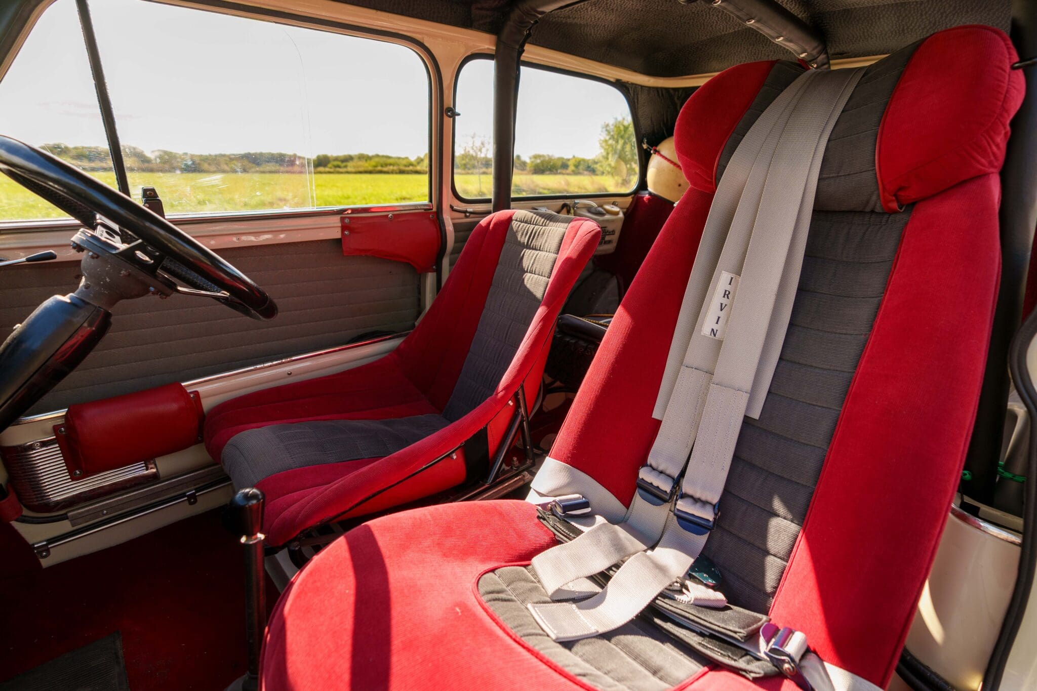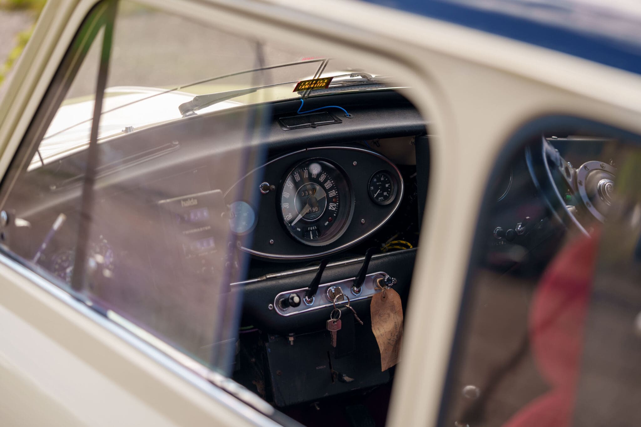 All of the “Works skidded” subframes were rebuilt and the hydrolastic interconnecting pipework remade to fit back inside the car, alongside battery, brake and wiring. This was done in the day to avoid any damage from under the car. The super rare Scandinavian sump guard is fitted (with inner collar). The car was re-wired using the original Lucas braided cables, mated to the fabulous works dashes. The car had all fuel pipes covered going through the back seat to the tanks, so that two studded tyres could be locked in place. The rear parcel shelf has the John Aley 3 point cage attached with two different wheel braces, one to fit Minilite wheels the other the standard mini nut. Ironically painted Red and Green (port and starboard perhaps???!). Spare nuts are carried within the car for steel wheel fitment. The boot area carries two “road” Minilite wheels, with the boot board having to be modified in the day to fit the 165 tyre. Both tank straps are modified. Within this area are the tools carried within a BMC tool bag, with the correct super-slim spanners. This compliments the tool roll that hangs from the bag shelf with further tools if they have problems. The super rare Elopress tyre/fire is located on the board. There is the correct modified jack that sits attached to the OSR pocket held in with a lovely strap for quick release. A later addition to the car is a works style roof rack with modified quick release clamps to ease those two Dunlop SP 44’s off! Seats – These are the correct type drivers and navigators’ seats with the strengthened brackets to hold them in place. They have the correct Irvin belts that can be modified for all driver sizes. (Current owner is 6’2”!)