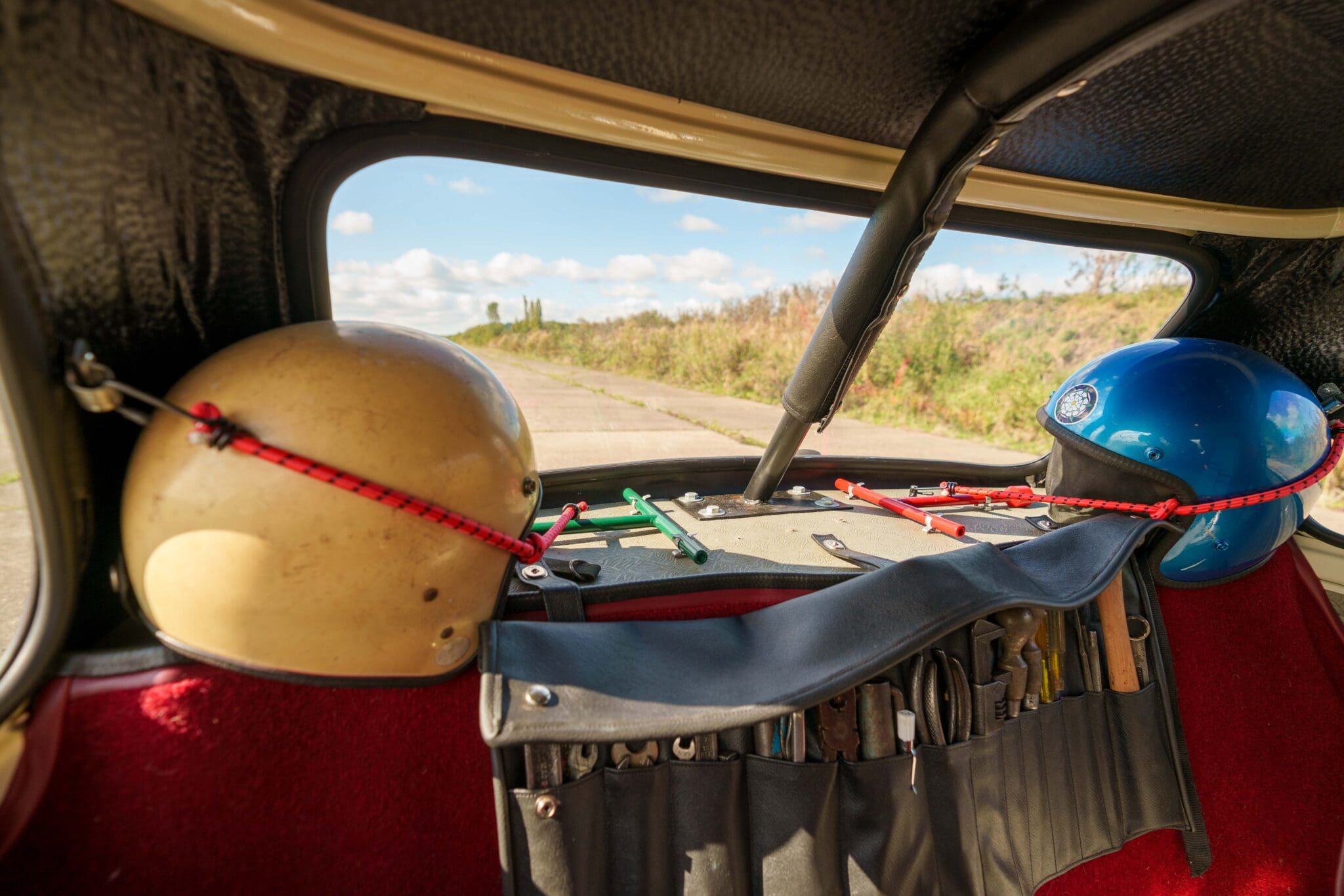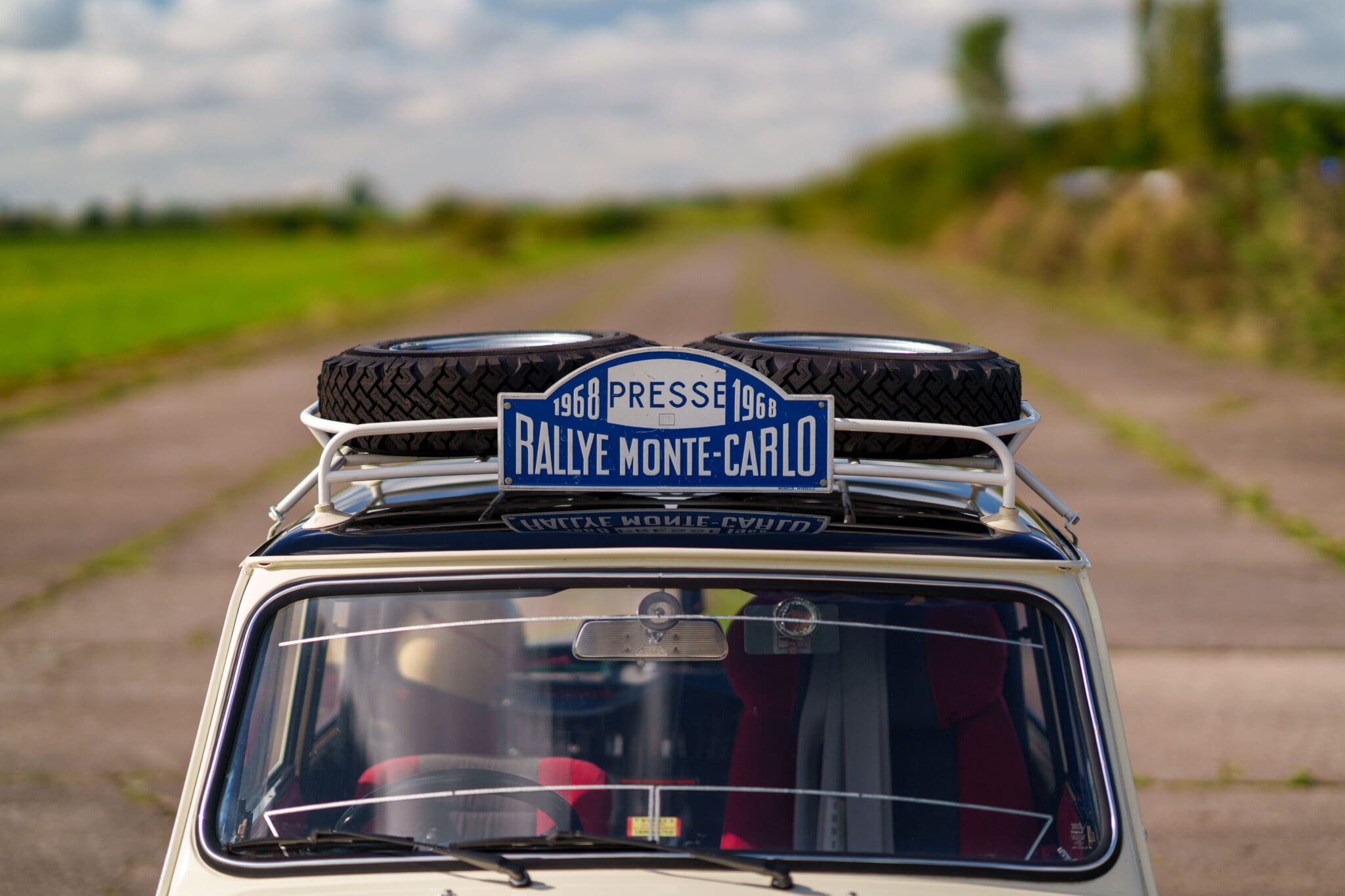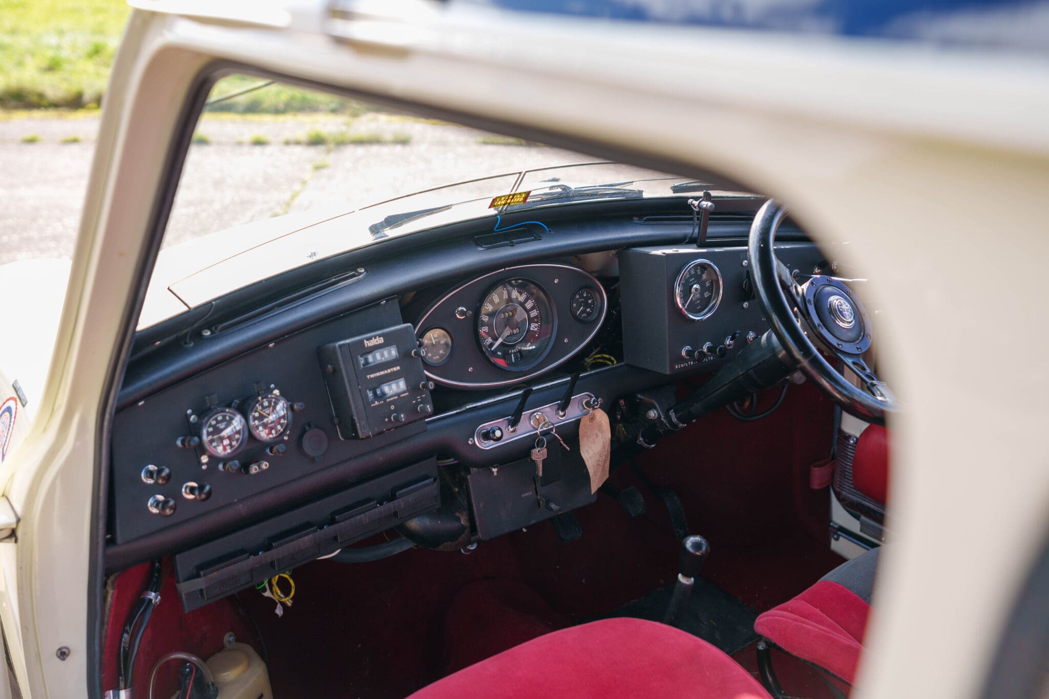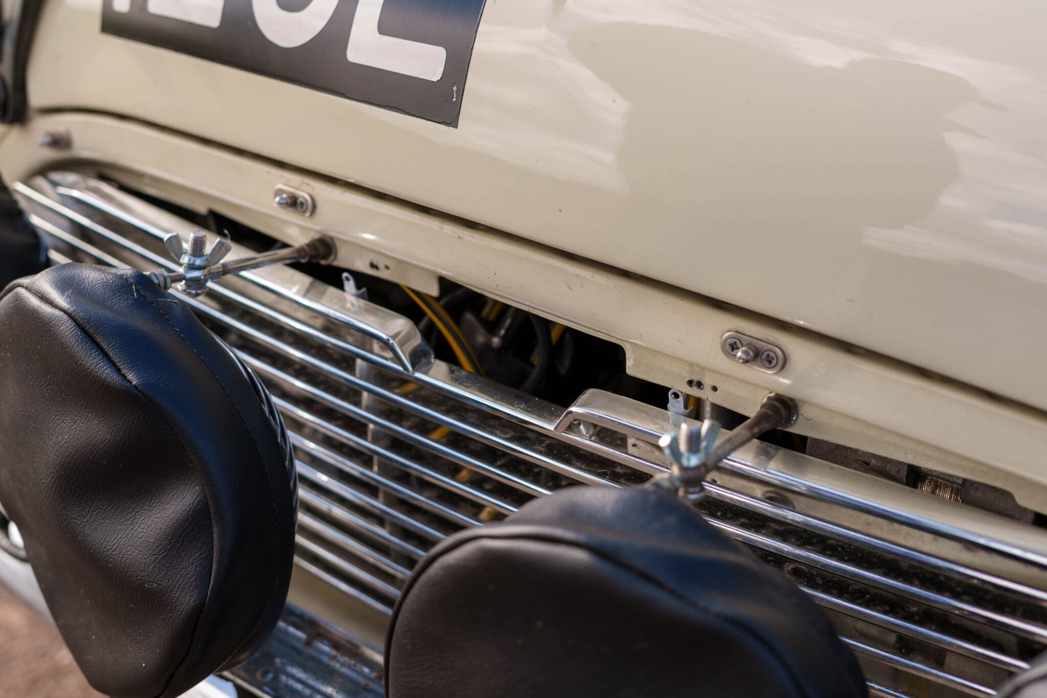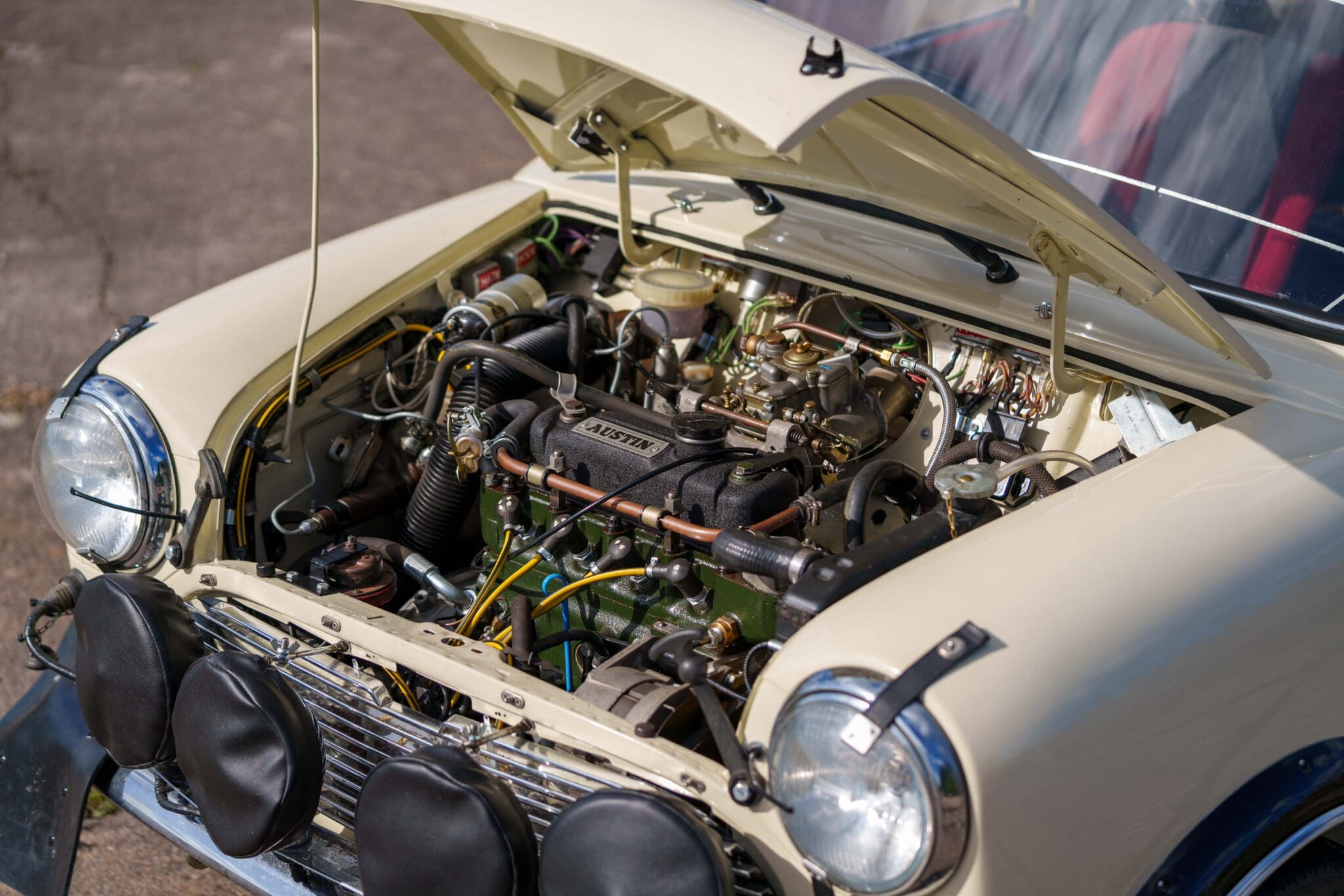 All of the “Works skidded” subframes were rebuilt and the hydrolastic interconnecting pipework remade to fit back inside the car, alongside battery, brake and wiring. This was done in the day to avoid any damage from under the car. The super rare Scandinavian sump guard is fitted (with inner collar). The car was re-wired using the original Lucas braided cables, mated to the fabulous works dashes. The car had all fuel pipes covered going through the back seat to the tanks, so that two studded tyres could be locked in place. The rear parcel shelf has the John Aley 3 point cage attached with two different wheel braces, one to fit Minilite wheels the other the standard mini nut. Ironically painted Red and Green (port and starboard perhaps???!). Spare nuts are carried within the car for steel wheel fitment. The boot area carries two “road” Minilite wheels, with the boot board having to be modified in the day to fit the 165 tyre. Both tank straps are modified. Within this area are the tools carried within a BMC tool bag, with the correct super-slim spanners. This compliments the tool roll that hangs from the bag shelf with further tools if they have problems. The super rare Elopress tyre/fire is located on the board. There is the correct modified jack that sits attached to the OSR pocket held in with a lovely strap for quick release. A later addition to the car is a works style roof rack with modified quick release clamps to ease those two Dunlop SP 44’s off! Seats – These are the correct type drivers and navigators’ seats with the strengthened brackets to hold them in place. They have the correct Irvin belts that can be modified for all driver sizes. (Current owner is 6’2”!)