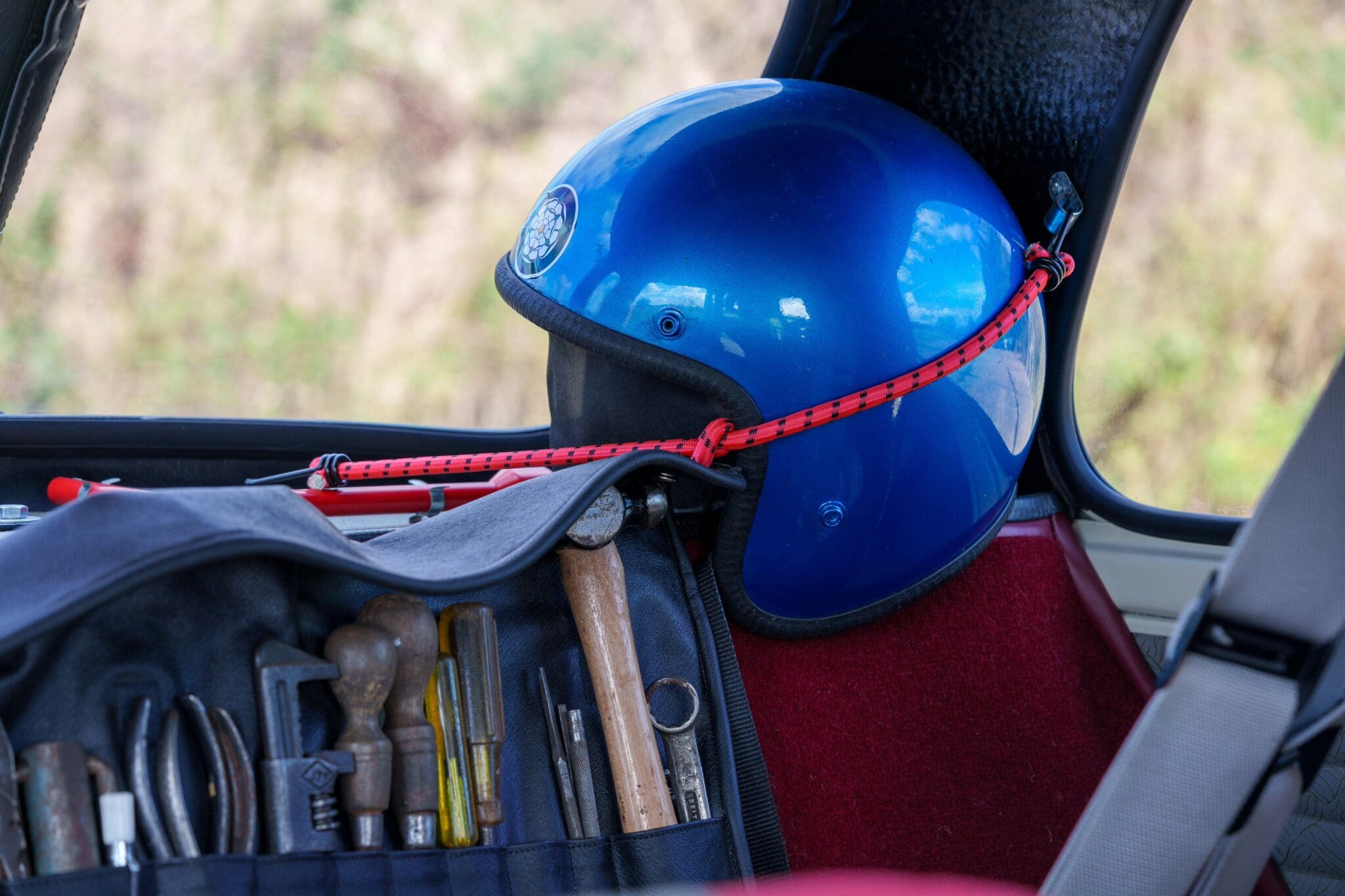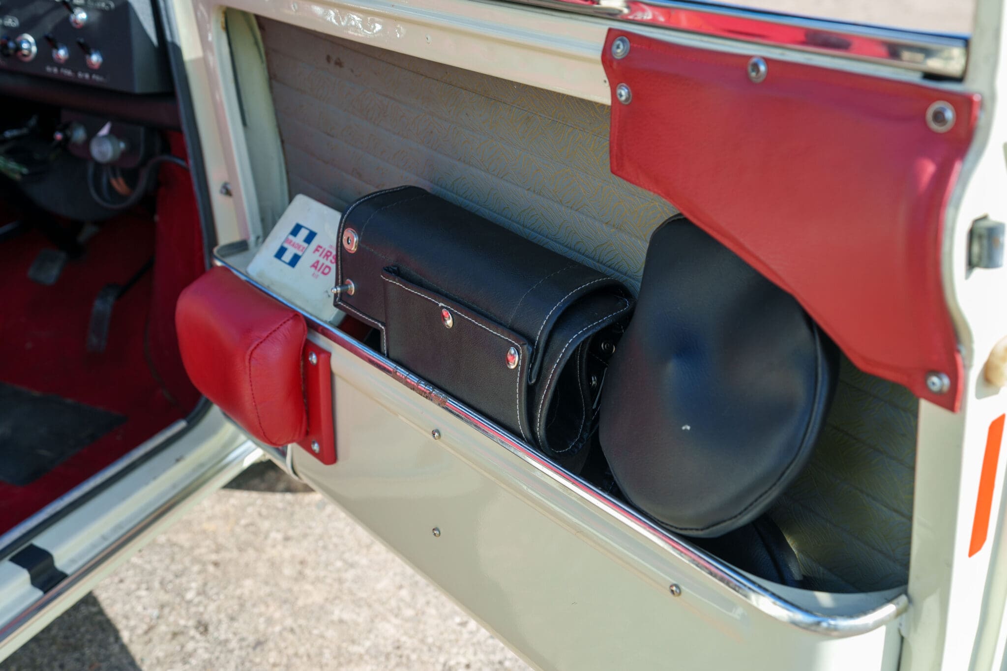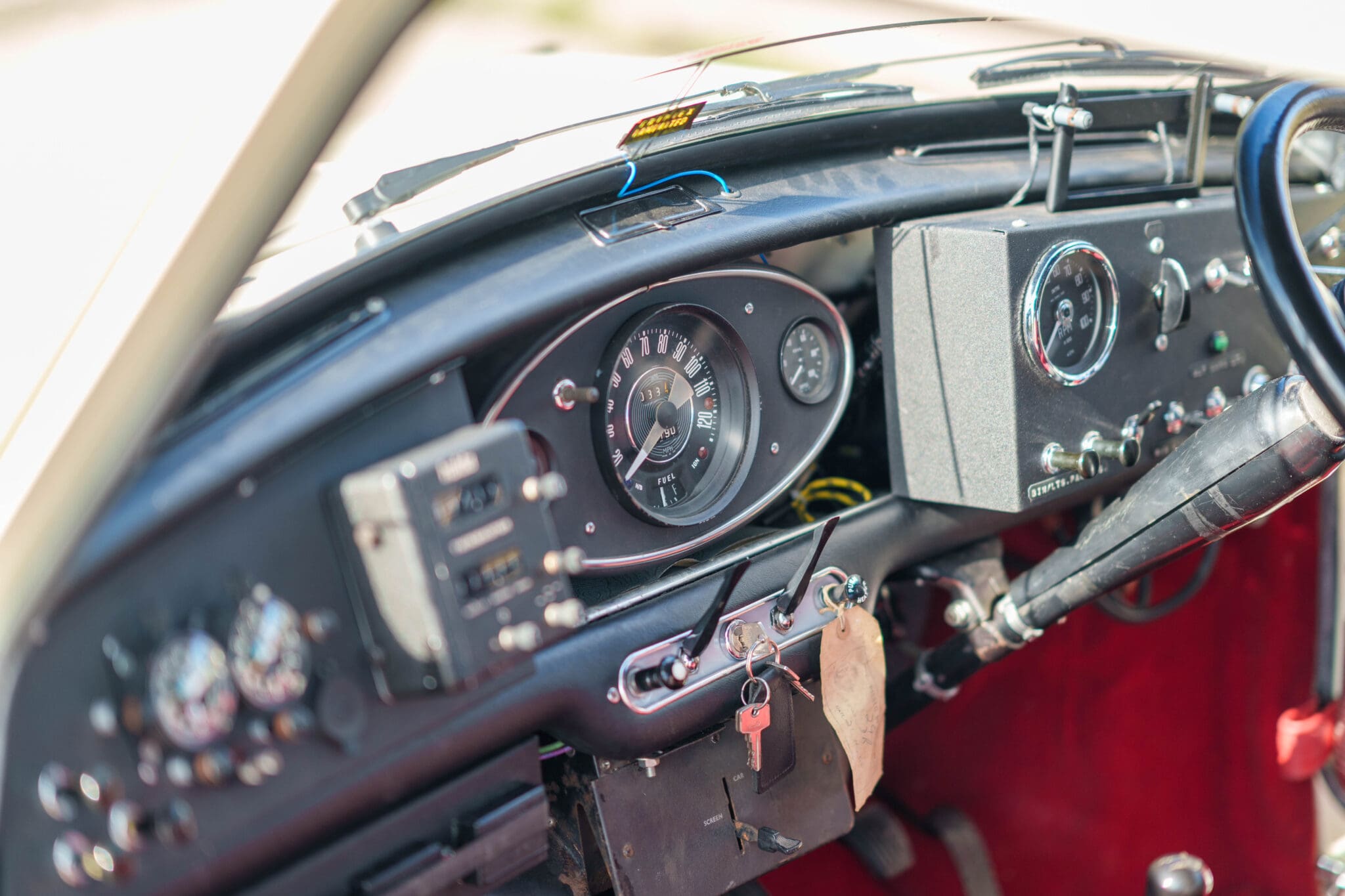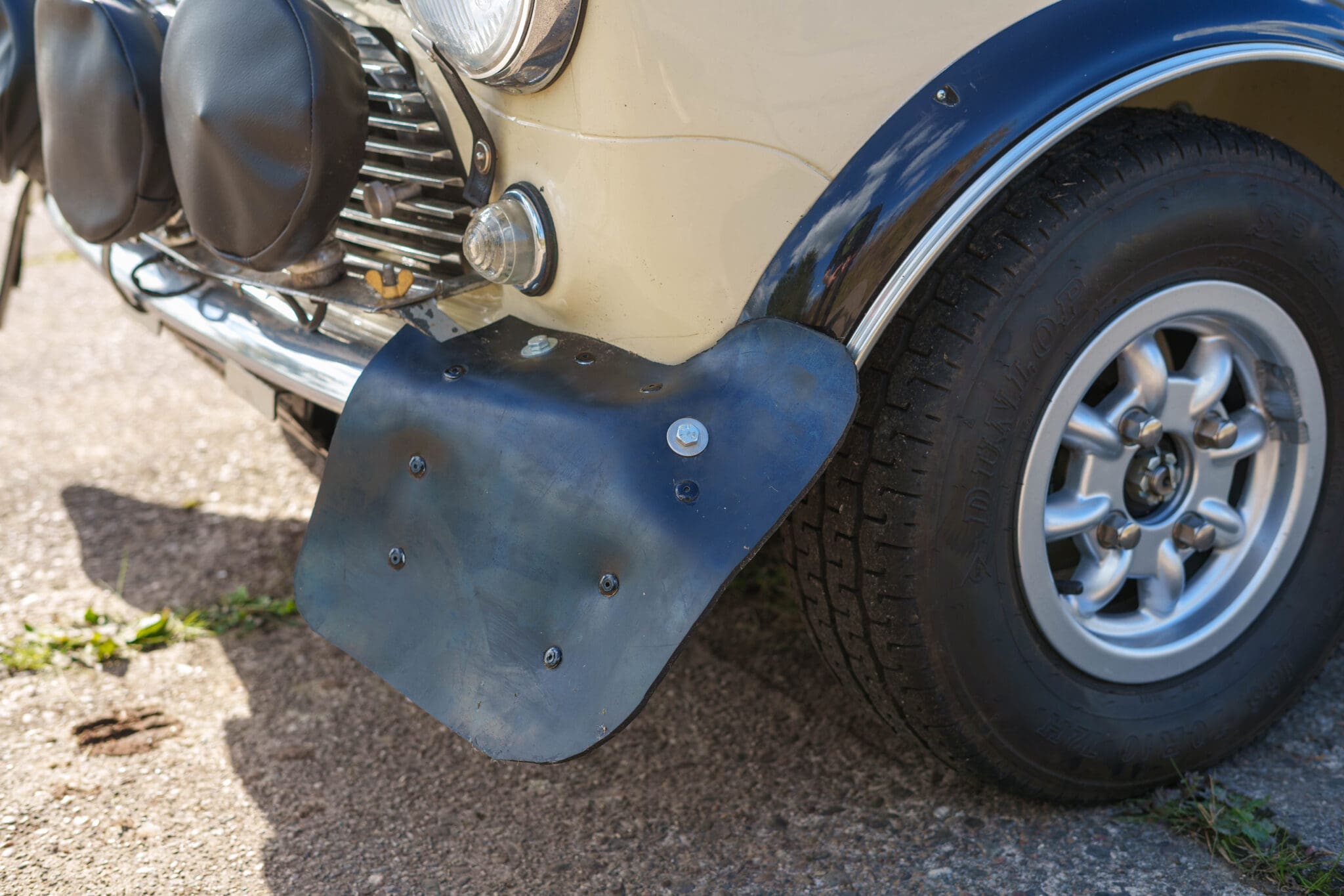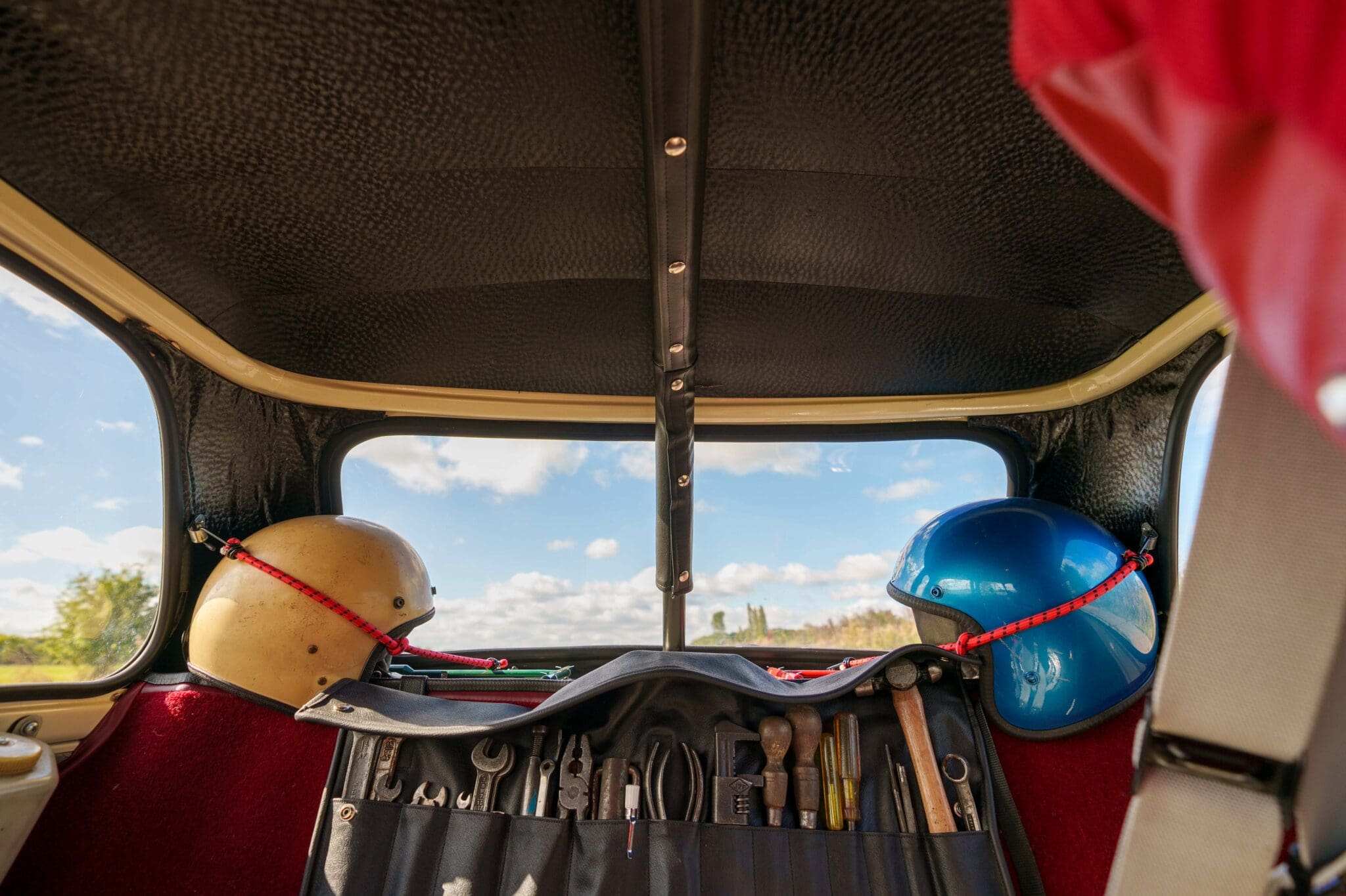 All of the “Works skidded” subframes were rebuilt and the hydrolastic interconnecting pipework remade to fit back inside the car, alongside battery, brake and wiring. This was done in the day to avoid any damage from under the car. The super rare Scandinavian sump guard is fitted (with inner collar). The car was re-wired using the original Lucas braided cables, mated to the fabulous works dashes. The car had all fuel pipes covered going through the back seat to the tanks, so that two studded tyres could be locked in place. The rear parcel shelf has the John Aley 3 point cage attached with two different wheel braces, one to fit Minilite wheels the other the standard mini nut. Ironically painted Red and Green (port and starboard perhaps???!). Spare nuts are carried within the car for steel wheel fitment. The boot area carries two “road” Minilite wheels, with the boot board having to be modified in the day to fit the 165 tyre. Both tank straps are modified. Within this area are the tools carried within a BMC tool bag, with the correct super-slim spanners. This compliments the tool roll that hangs from the bag shelf with further tools if they have problems. The super rare Elopress tyre/fire is located on the board. There is the correct modified jack that sits attached to the OSR pocket held in with a lovely strap for quick release. A later addition to the car is a works style roof rack with modified quick release clamps to ease those two Dunlop SP 44’s off! Seats – These are the correct type drivers and navigators’ seats with the strengthened brackets to hold them in place. They have the correct Irvin belts that can be modified for all driver sizes. (Current owner is 6’2”!)