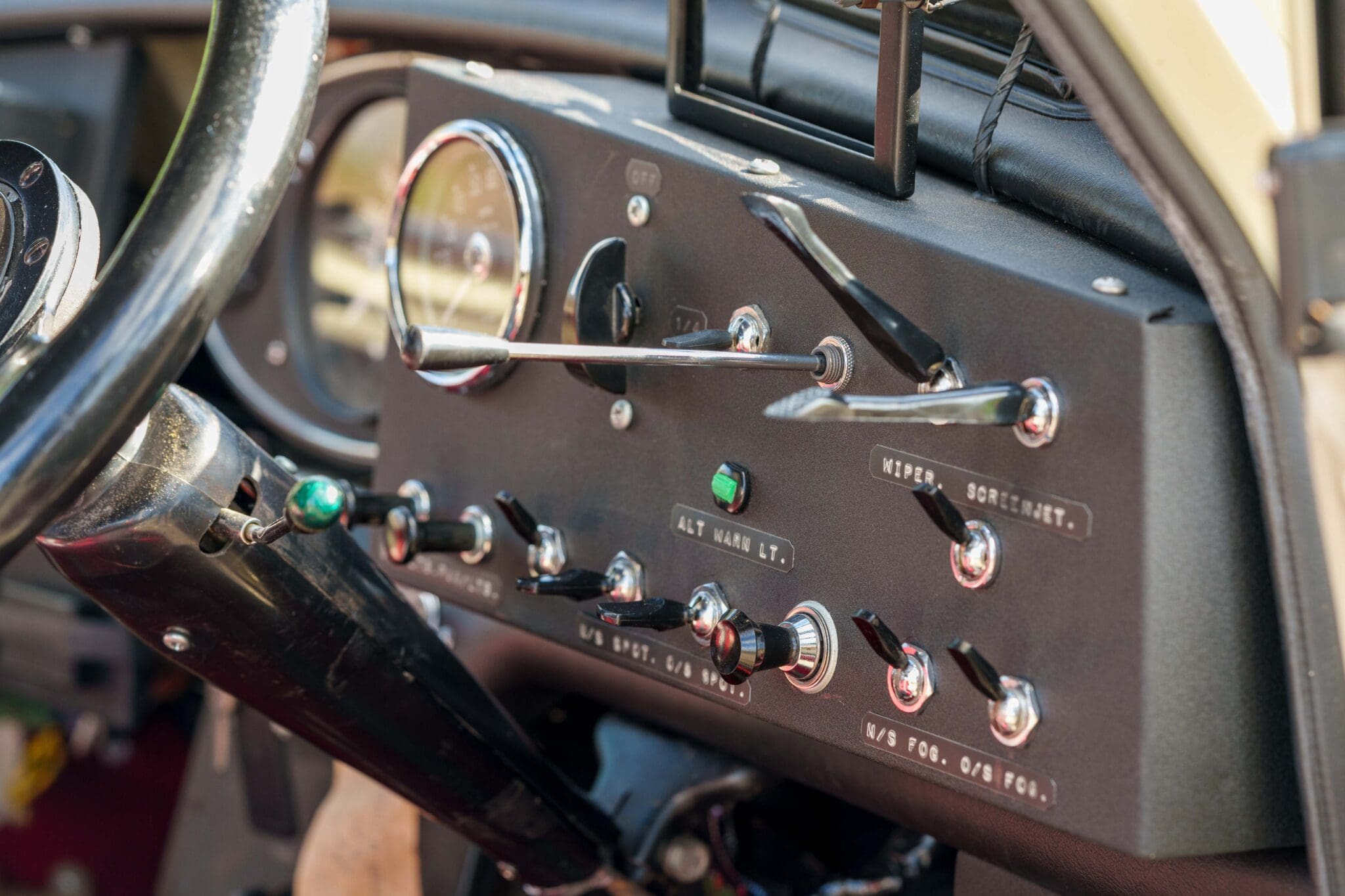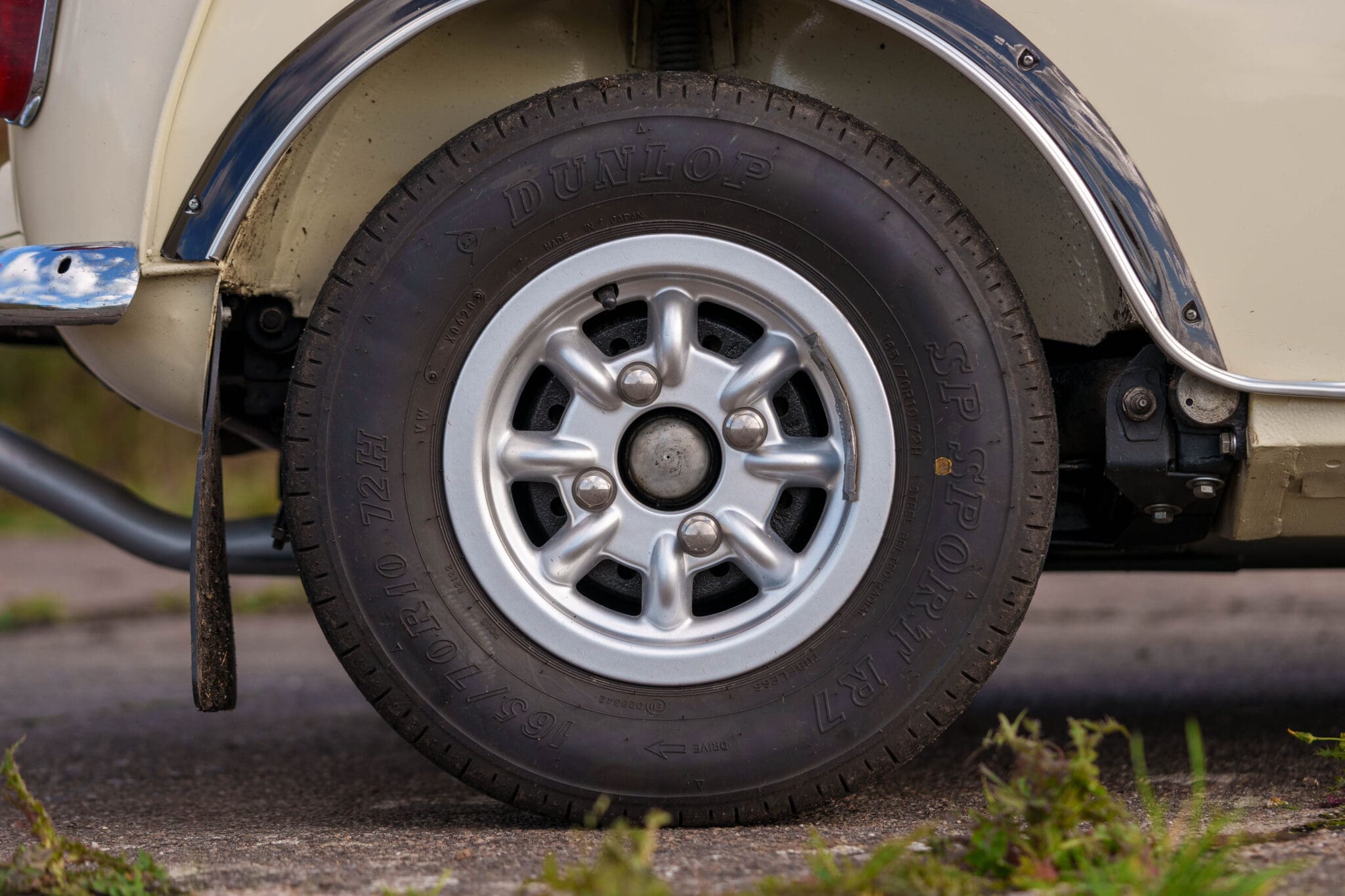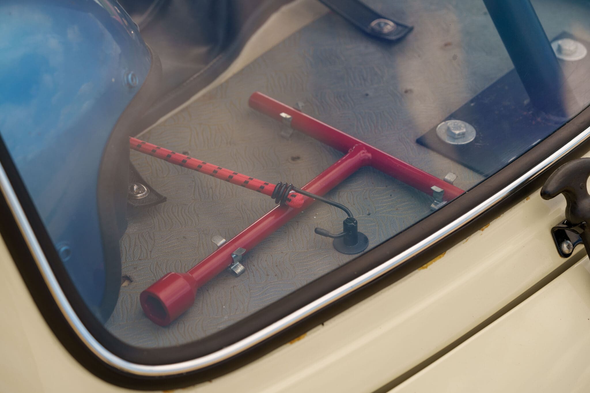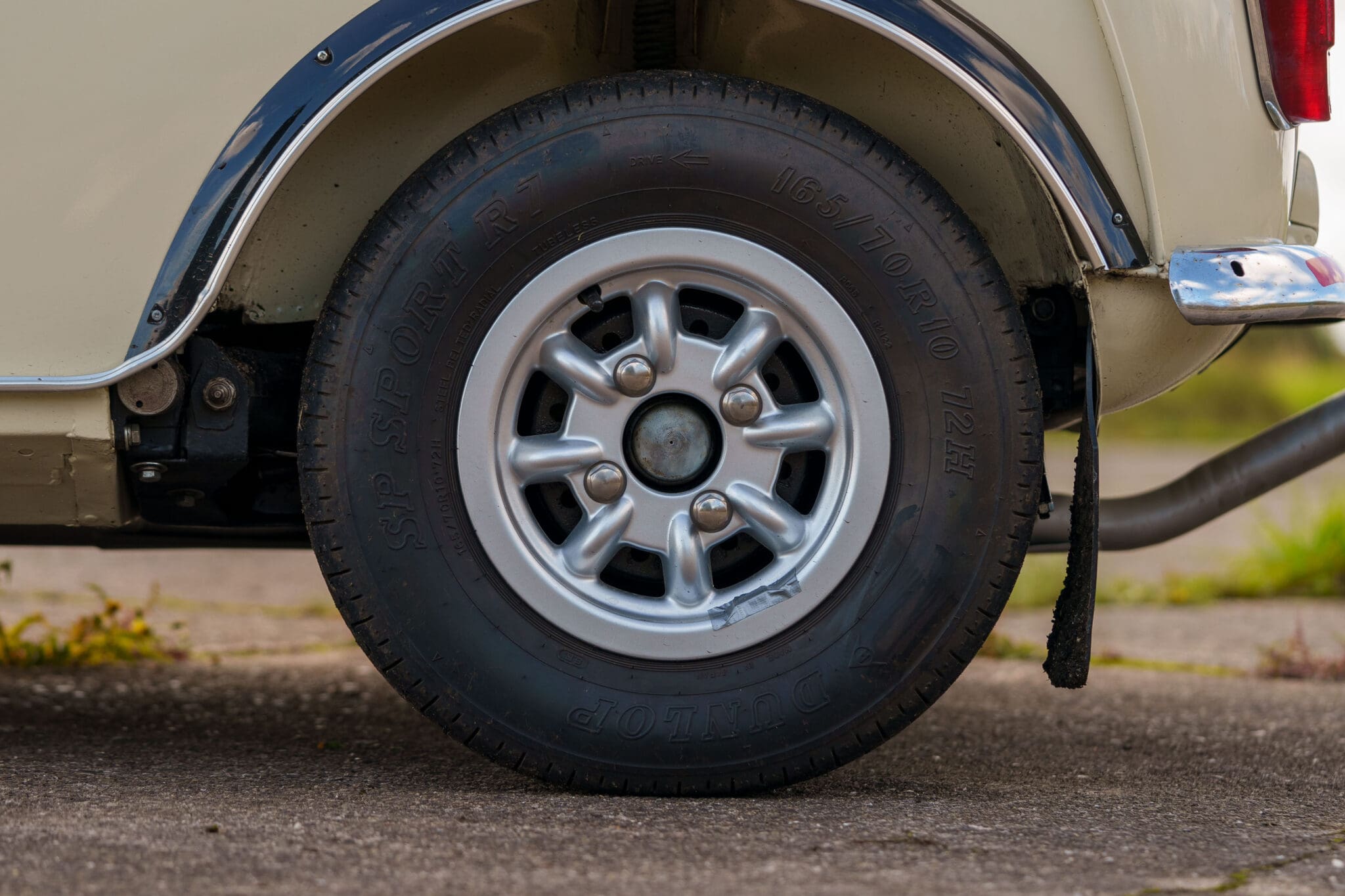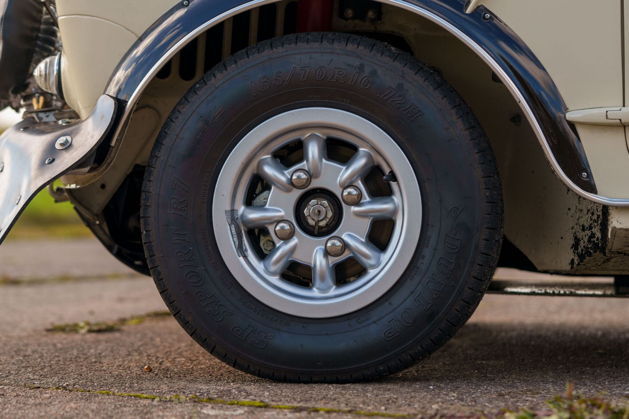 All of the “Works skidded” subframes were rebuilt and the hydrolastic interconnecting pipework remade to fit back inside the car, alongside battery, brake and wiring. This was done in the day to avoid any damage from under the car. The super rare Scandinavian sump guard is fitted (with inner collar). The car was re-wired using the original Lucas braided cables, mated to the fabulous works dashes. The car had all fuel pipes covered going through the back seat to the tanks, so that two studded tyres could be locked in place. The rear parcel shelf has the John Aley 3 point cage attached with two different wheel braces, one to fit Minilite wheels the other the standard mini nut. Ironically painted Red and Green (port and starboard perhaps???!). Spare nuts are carried within the car for steel wheel fitment. The boot area carries two “road” Minilite wheels, with the boot board having to be modified in the day to fit the 165 tyre. Both tank straps are modified. Within this area are the tools carried within a BMC tool bag, with the correct super-slim spanners. This compliments the tool roll that hangs from the bag shelf with further tools if they have problems. The super rare Elopress tyre/fire is located on the board. There is the correct modified jack that sits attached to the OSR pocket held in with a lovely strap for quick release. A later addition to the car is a works style roof rack with modified quick release clamps to ease those two Dunlop SP 44’s off! Seats – These are the correct type drivers and navigators’ seats with the strengthened brackets to hold them in place. They have the correct Irvin belts that can be modified for all driver sizes. (Current owner is 6’2”!)