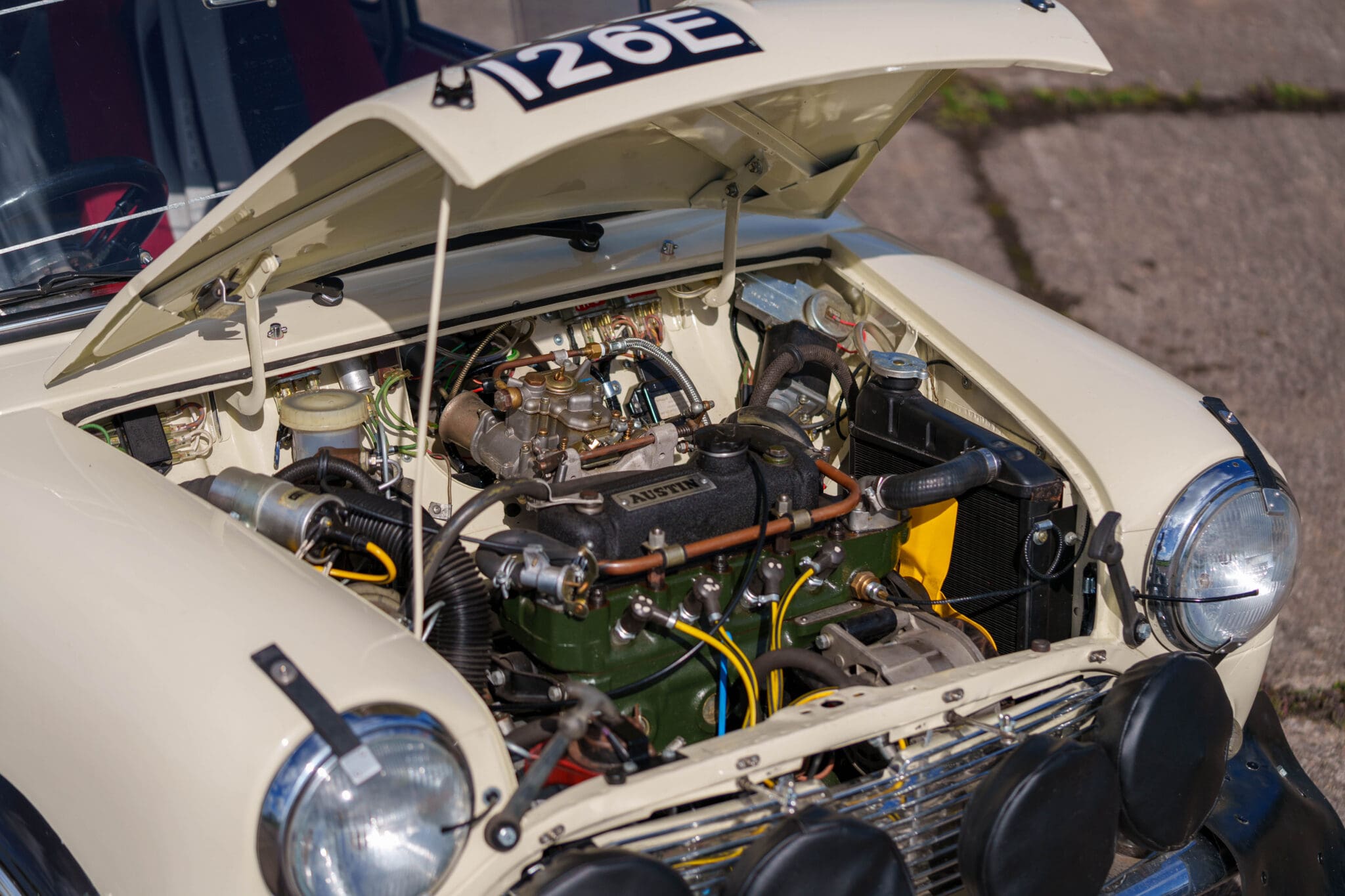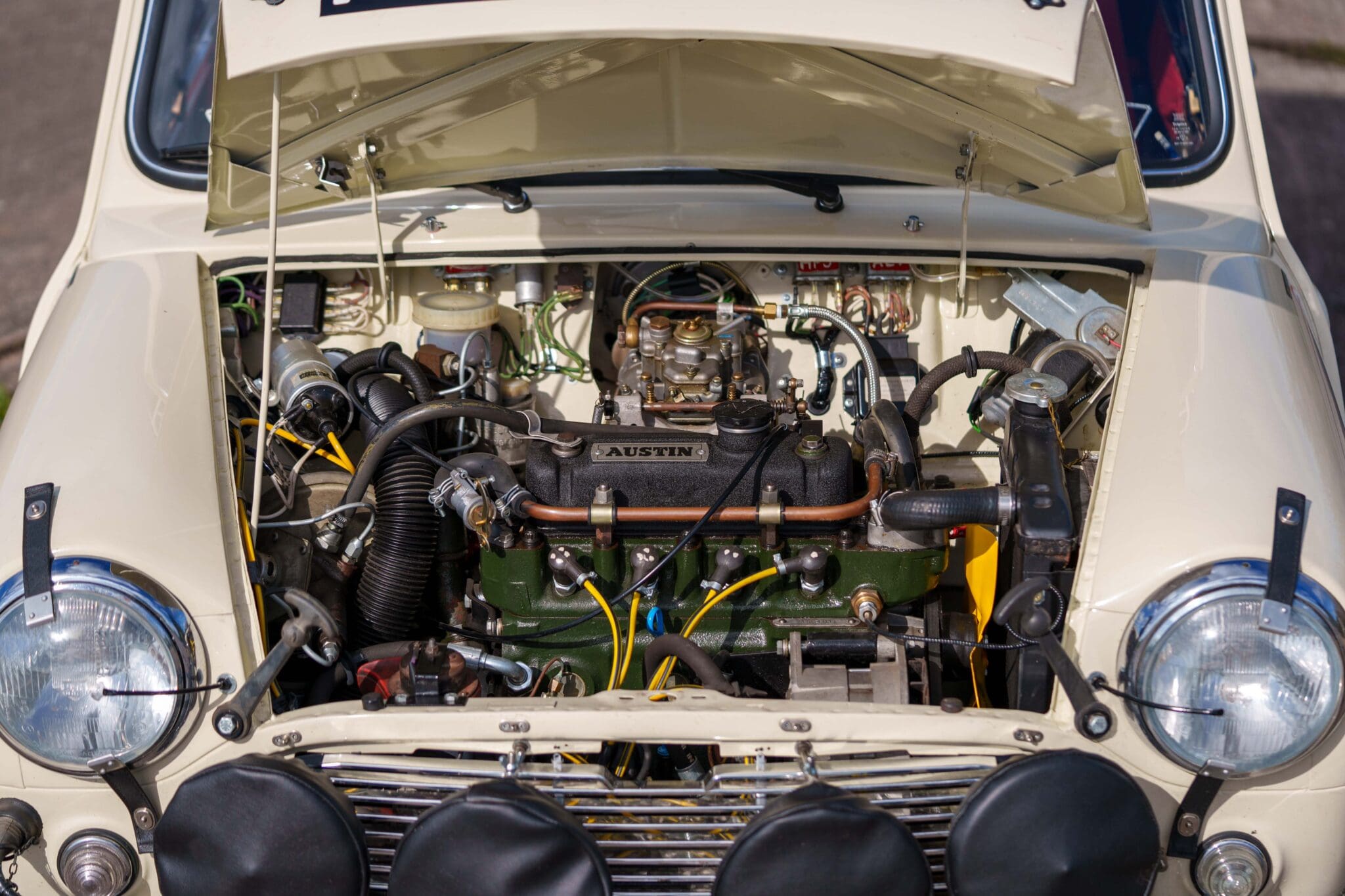 Restoration – As previously mentioned, the car was in a tired state following its rallying career, however it importantly retains its original 1967 bodyshell and many original features that are unique to this vehicle. It started life as a pretty standard MK1 Cooper S that was used as a test bed for Cliff Humphries – the resident development engineer at BMC Abingdon Comps Dept. When the restoration started, it was apparent that the car had been developed into a Group 6 lightweight car. This included fitment of an aluminium boot, bonnet and doors, plus Perspex side, rear and back windows. The engine was changed out to a development XSP 1293cc unit (whilst at the Comps dept), fully rebuilt by Swiftune for Norman at the time (but never used). The car had been mated with an 8-port Injection engine at some point, with witness holes within the shell.