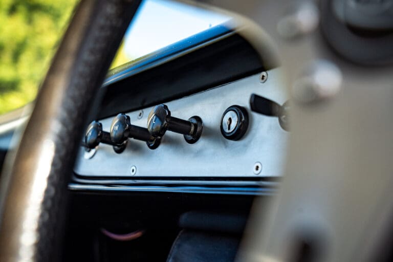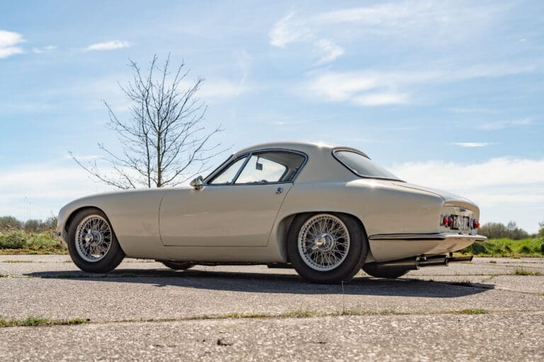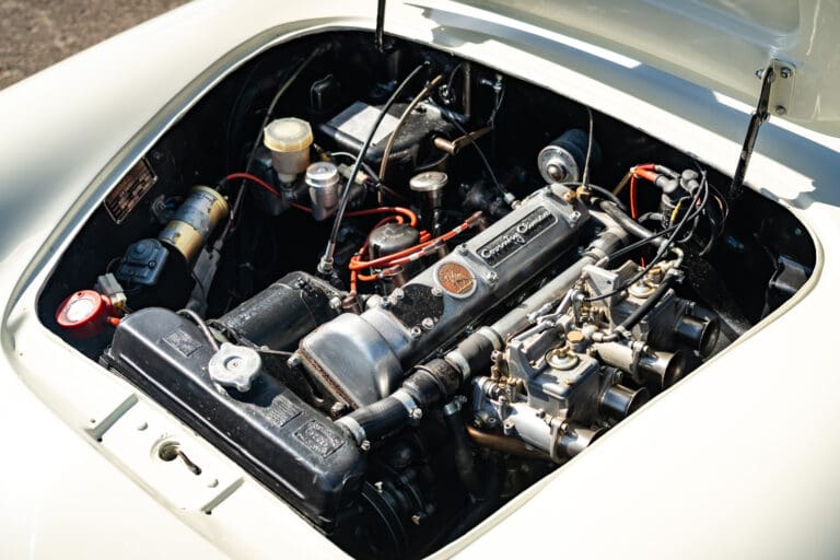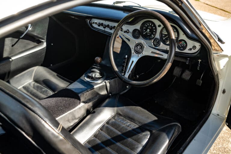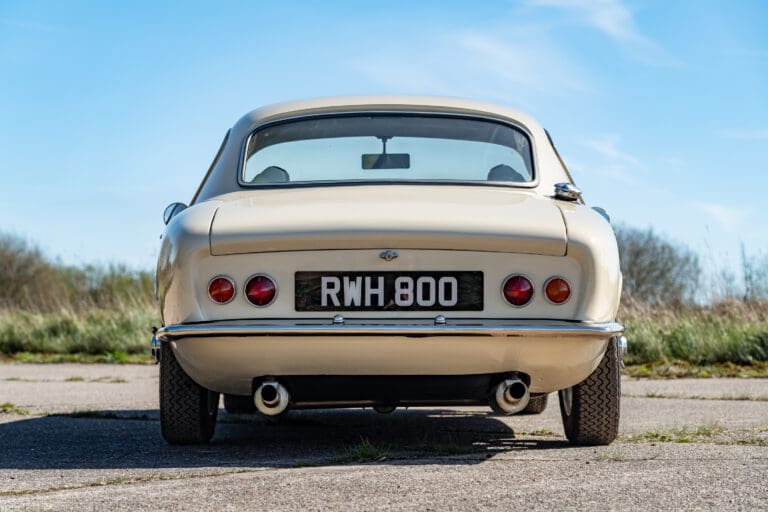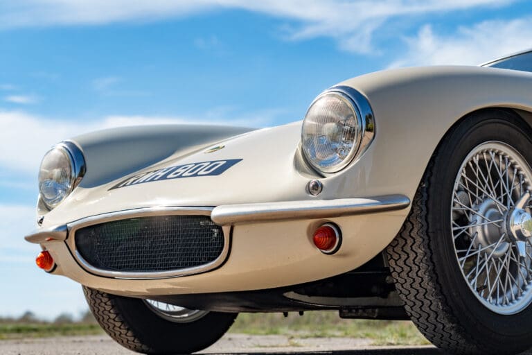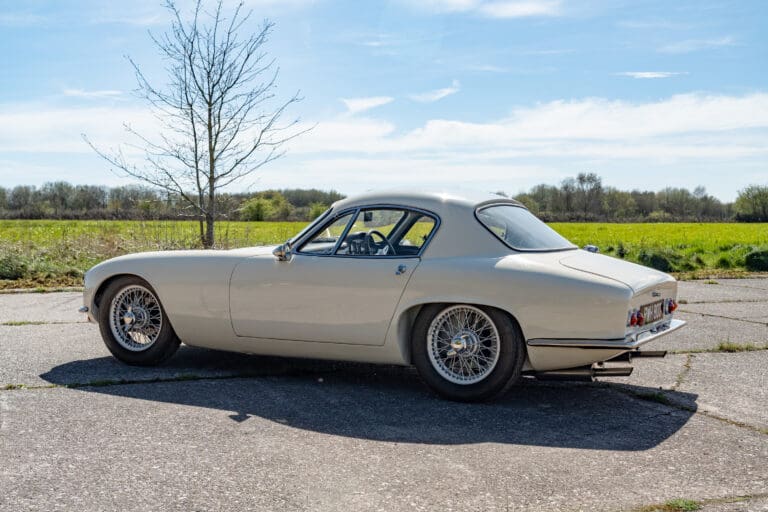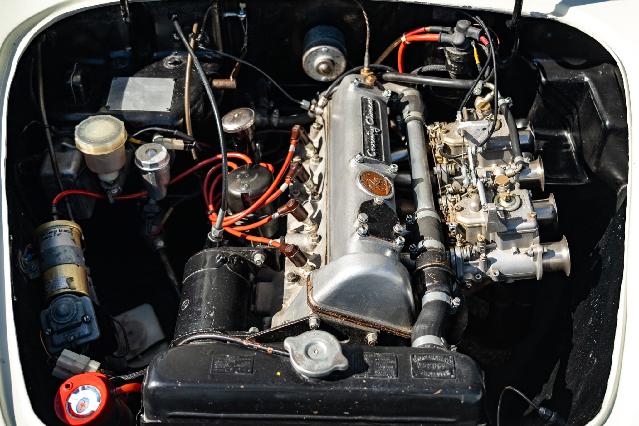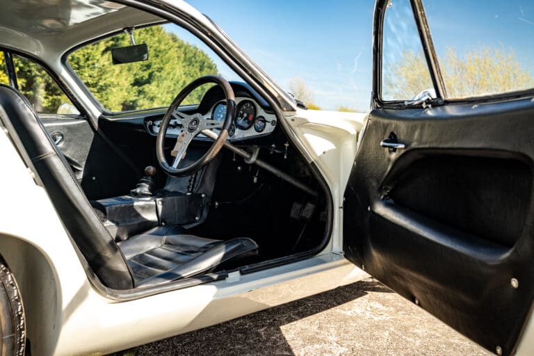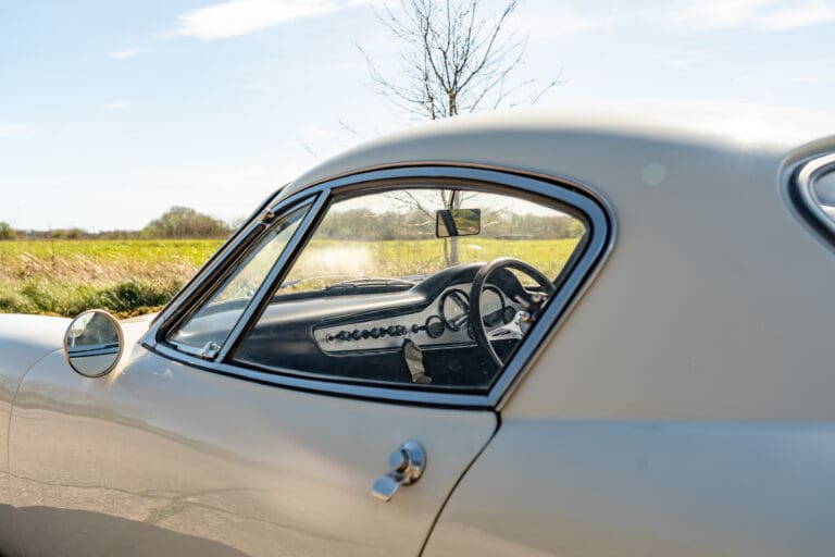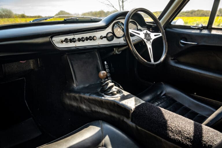 Unveiled at the 1957 London Motor Show, the Elite (Type 14) was Colin Chapman’s first production road car and also the world’s first fibreglass monocoque. The specification included Formula 2-derived all-round independent suspension and four-wheel disc brakes (inboard at the rear). Powered by a Coventry-Climax SOHC four-cylinder ‘FWE’ engine mated to four-speed manual transmission, its amazing 0.29 drag co-efficiency allowed all but the basic variant to claim a top speed of over 120mph. The work of Peter Kirwin-Taylor, aerodynamicist Frank Costin and John Frayling, the coupe’s super sleek silhouette is still considered a masterpiece. The first 250 or so examples, including this car, were fitted with ‘Maximar’ bodies, whilst later cars had their coachwork outsourced to the Bristol Aeroplane Company.