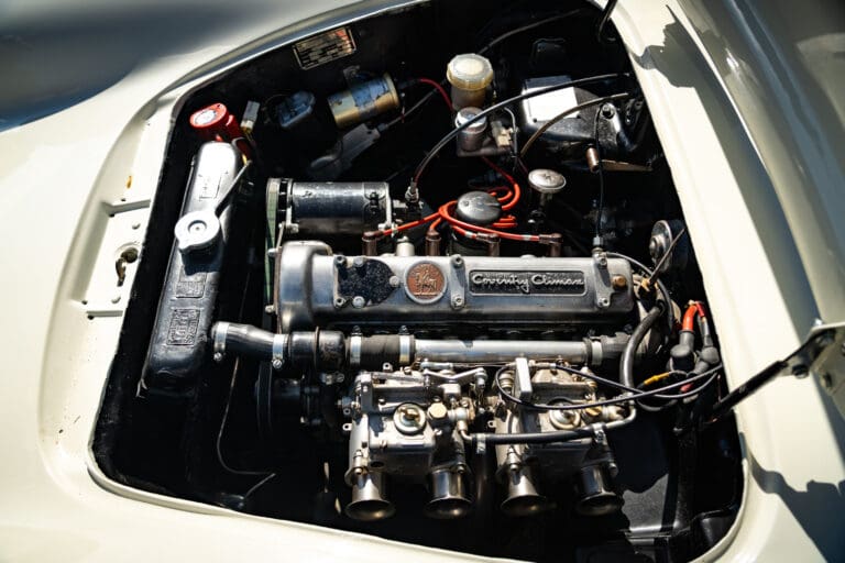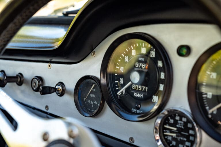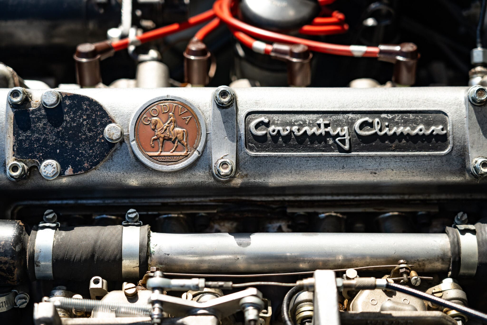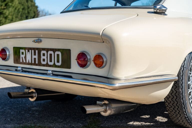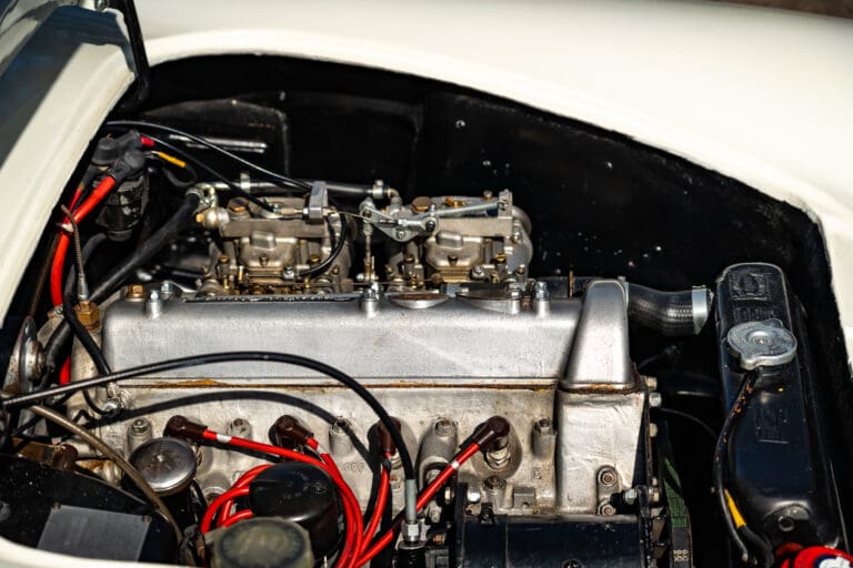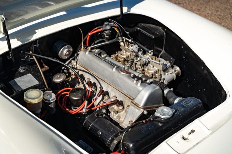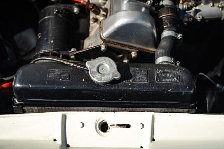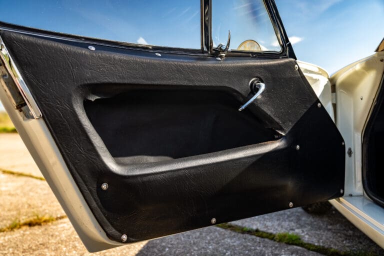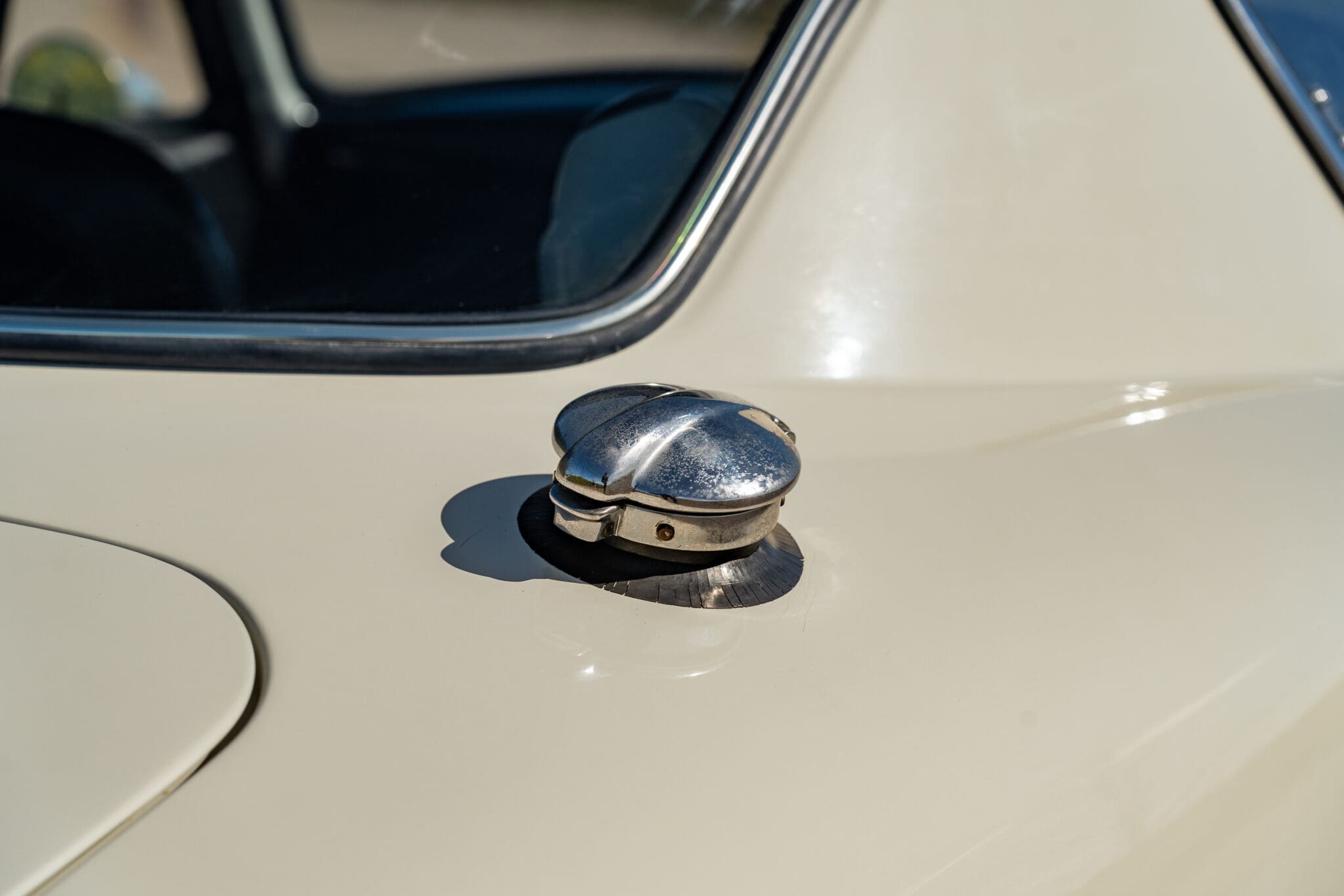 Unveiled at the 1957 London Motor Show, the Elite (Type 14) was Colin Chapman’s first production road car and also the world’s first fibreglass monocoque. The specification included Formula 2-derived all-round independent suspension and four-wheel disc brakes (inboard at the rear). Powered by a Coventry-Climax SOHC four-cylinder ‘FWE’ engine mated to four-speed manual transmission, its amazing 0.29 drag co-efficiency allowed all but the basic variant to claim a top speed of over 120mph. The work of Peter Kirwin-Taylor, aerodynamicist Frank Costin and John Frayling, the coupe’s super sleek silhouette is still considered a masterpiece. The first 250 or so examples, including this car, were fitted with ‘Maximar’ bodies, whilst later cars had their coachwork outsourced to the Bristol Aeroplane Company.