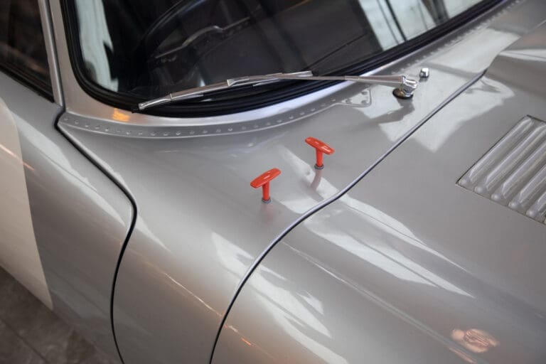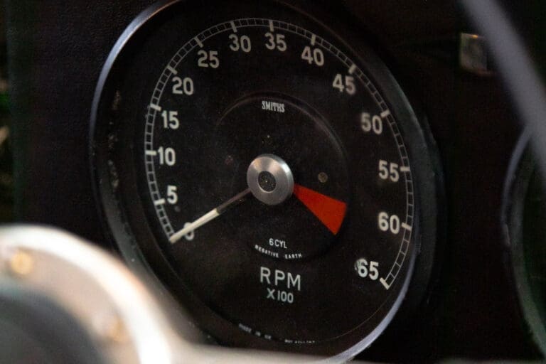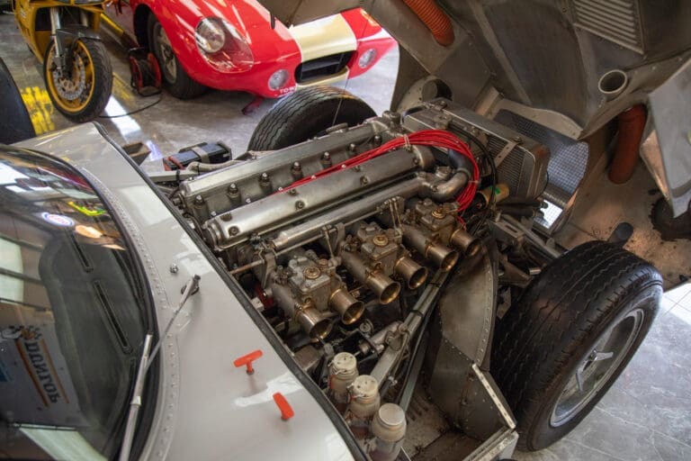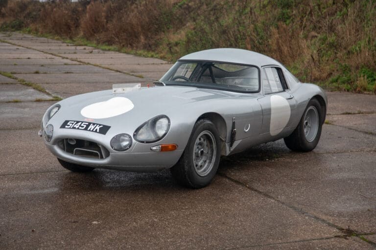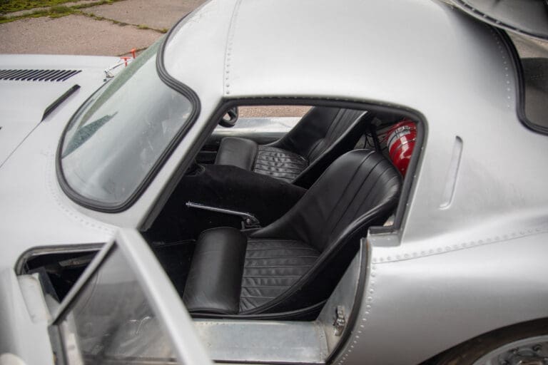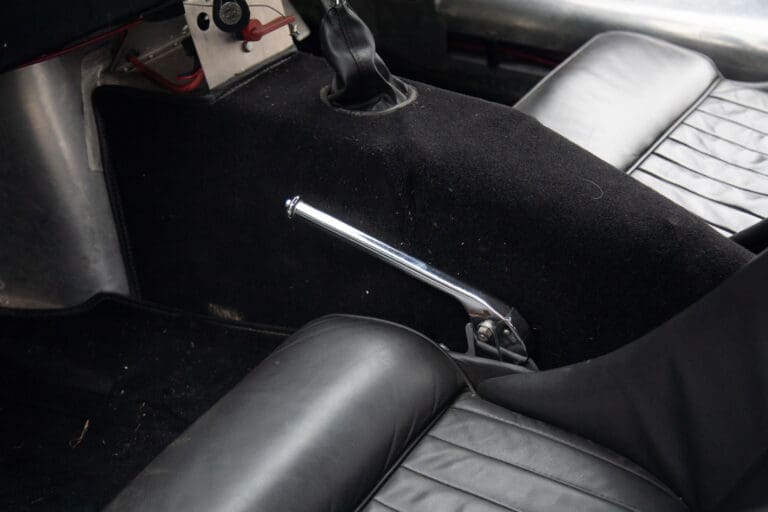 The E-type now wears a period Coventry registration number plate ‘5145WK’, very similar to those used by the Works on the factory ‘lightweight’ cars. Interestingly, the original registration number was ‘1258 WK’, when supplied by Henleys of London to a Dr. Burton, confirmed on the accompanying Heritage certificate. Whilst the HTP has now lapsed, the impressive specification still boasts its FIA specification roll cage, plumbed-in fire extinguisher, electrical cut off with internal and external pulls, 8000rpm chronometric tachometer and a removable steering wheel. A long-range fuel tank is installed and the cockpit features two trimmed bucket seats, with four points racing harnesses. The passenger seat hinges forwards to access the rear brakes through the ’trap door’ in the bulkhead. The brakes were uprated, but legal and fully compliant with FIA rulings and the shock absorbers are fully-adjustable Leda units. Riding on magnesium peg-drive wheels, handling is aided with an uprated anti roll bar / subframe.