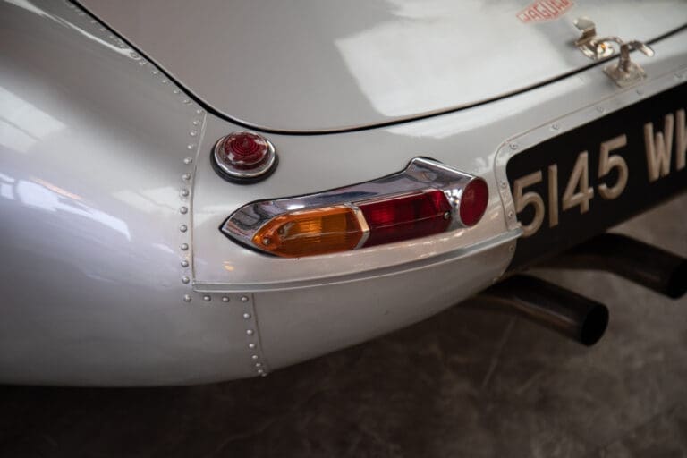 Right from the moment deliveries commenced in 1961, the E-Type began to find its way on to the world’s racetracks. In the Grand Touring class for production sports cars the E-Type proved competitive right from the start, Graham Hill celebrating the model’s racing debut by winning at Oulton Park on 3rd April 1961. The elevation of the GT class to Manufacturers’ Championship status for 1963 prompted Jaguar to develop a small batch of very special lightweight cars to challenge Ferrari. The FIA’s regulations for the Gran Turismo category stipulated that a minimum of 100 cars had to be built, but permitted coachwork modifications, thus enabling Jaguar to claim that its lightweights were standard E-types fitted with altered bodywork. (This is the same loophole exploited by Ferrari to get the limited edition 250 GTO homologated, by claiming that they were re-bodied 250 GTs). In fact, all 12 lightweight E-Types constructed in period were built from scratch with aluminium bodies, though they were invoiced as a new standard road car with additional modifications and numbered in the normal production sequence, albeit with an ‘S’ chassis number prefix!