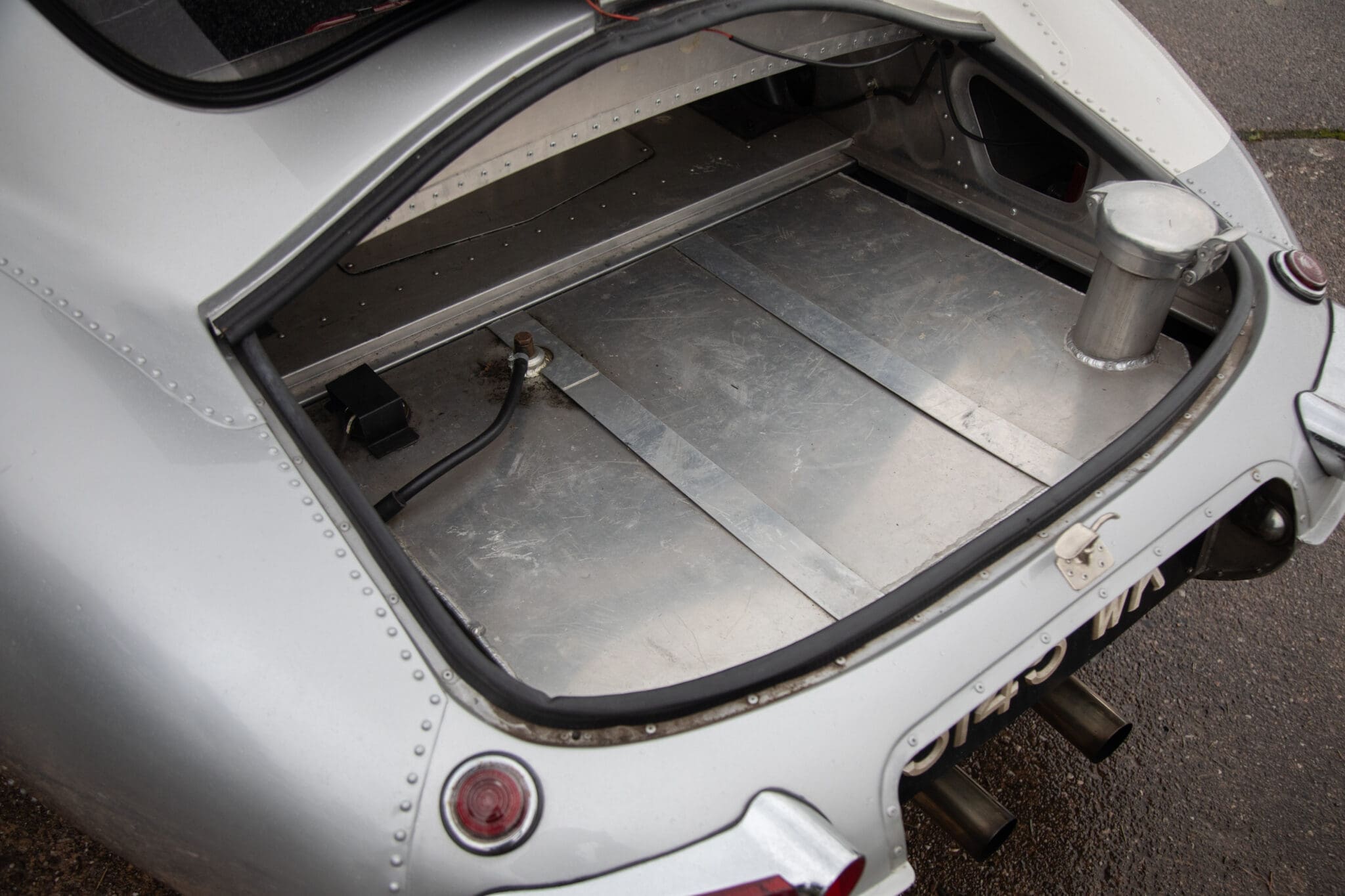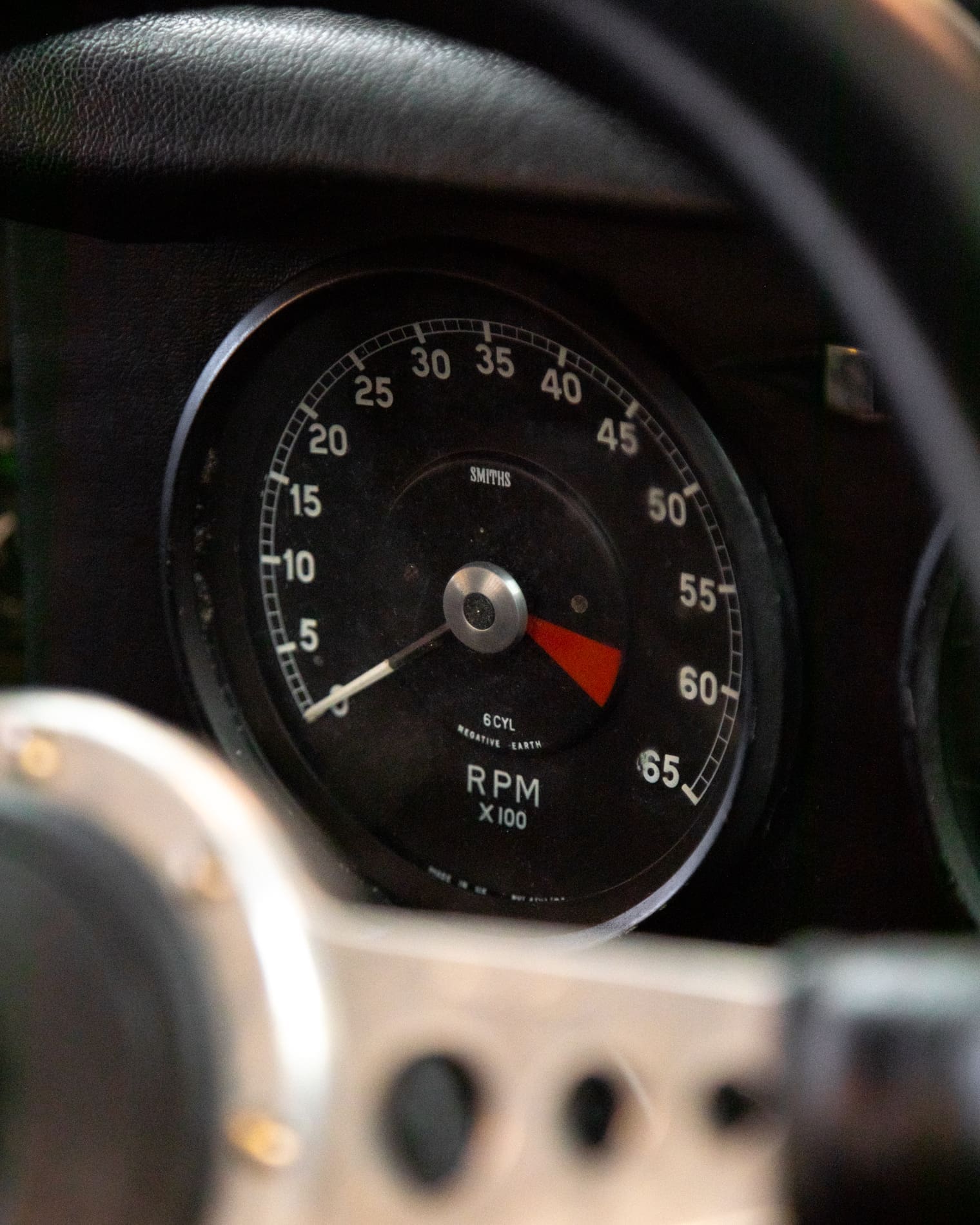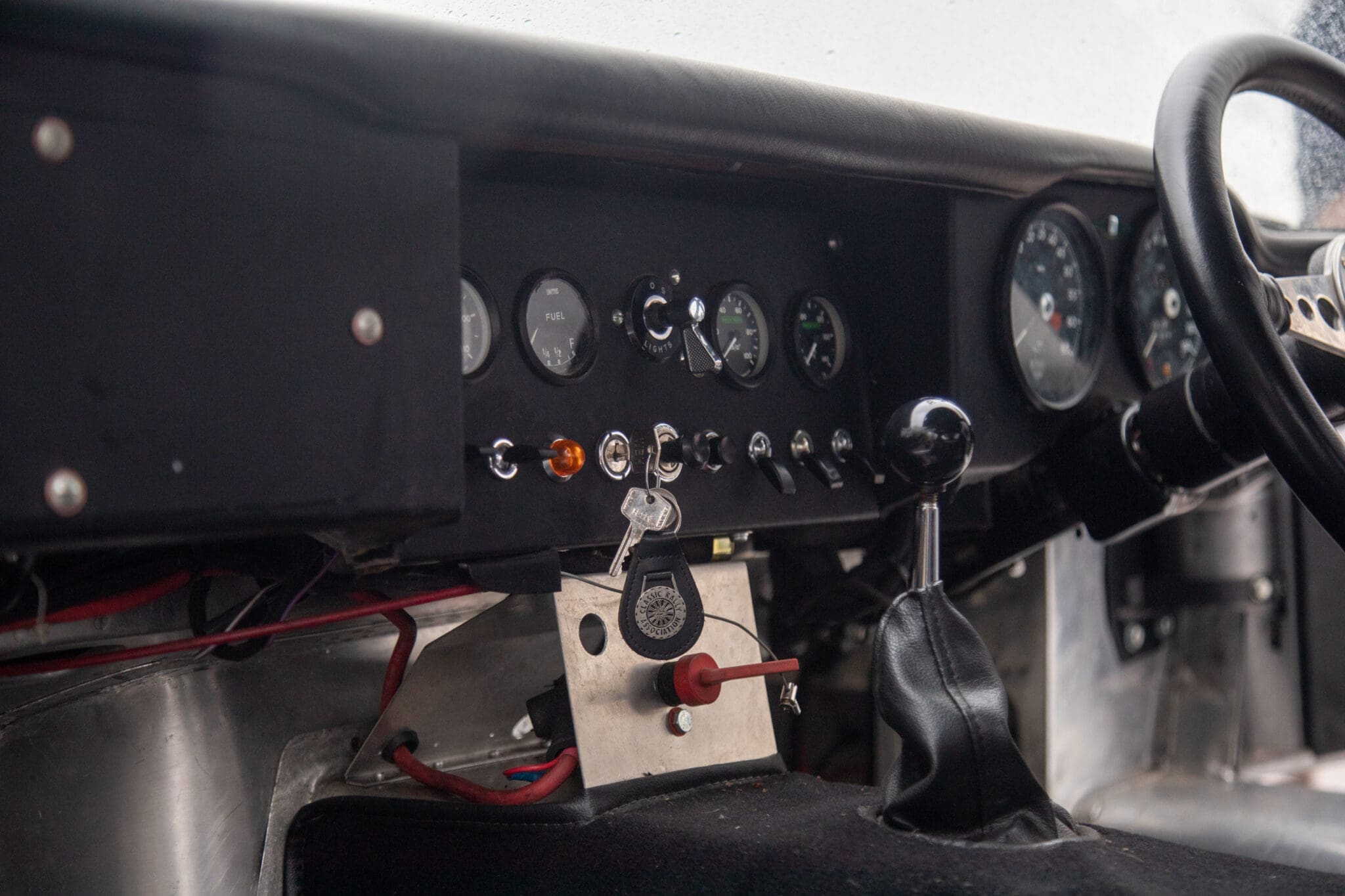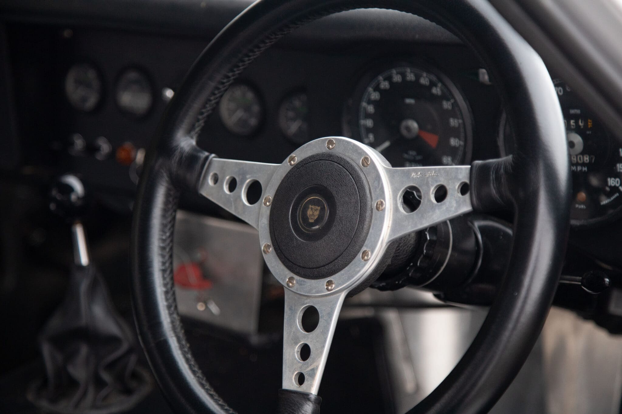 The E-type now wears a period Coventry registration number plate ‘5145WK’, very similar to those used by the Works on the factory ‘lightweight’ cars. Interestingly, the original registration number was ‘1258 WK’, when supplied by Henleys of London to a Dr. Burton, confirmed on the accompanying Heritage certificate. Whilst the HTP has now lapsed, the impressive specification still boasts its FIA specification roll cage, plumbed-in fire extinguisher, electrical cut off with internal and external pulls, 8000rpm chronometric tachometer and a removable steering wheel. A long-range fuel tank is installed and the cockpit features two trimmed bucket seats, with four points racing harnesses. The passenger seat hinges forwards to access the rear brakes through the ’trap door’ in the bulkhead. The brakes were uprated, but legal and fully compliant with FIA rulings and the shock absorbers are fully-adjustable Leda units. Riding on magnesium peg-drive wheels, handling is aided with an uprated anti roll bar / subframe.
