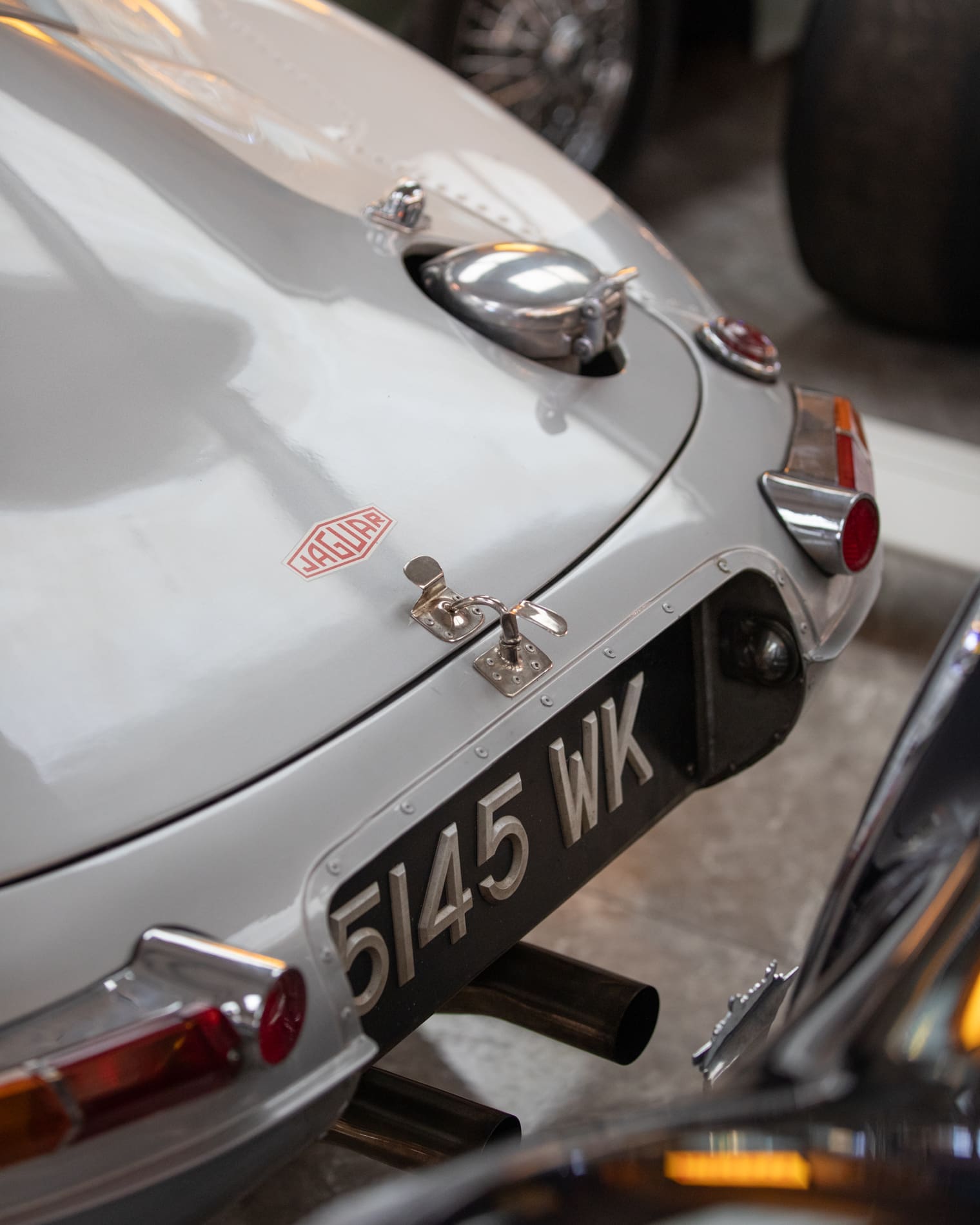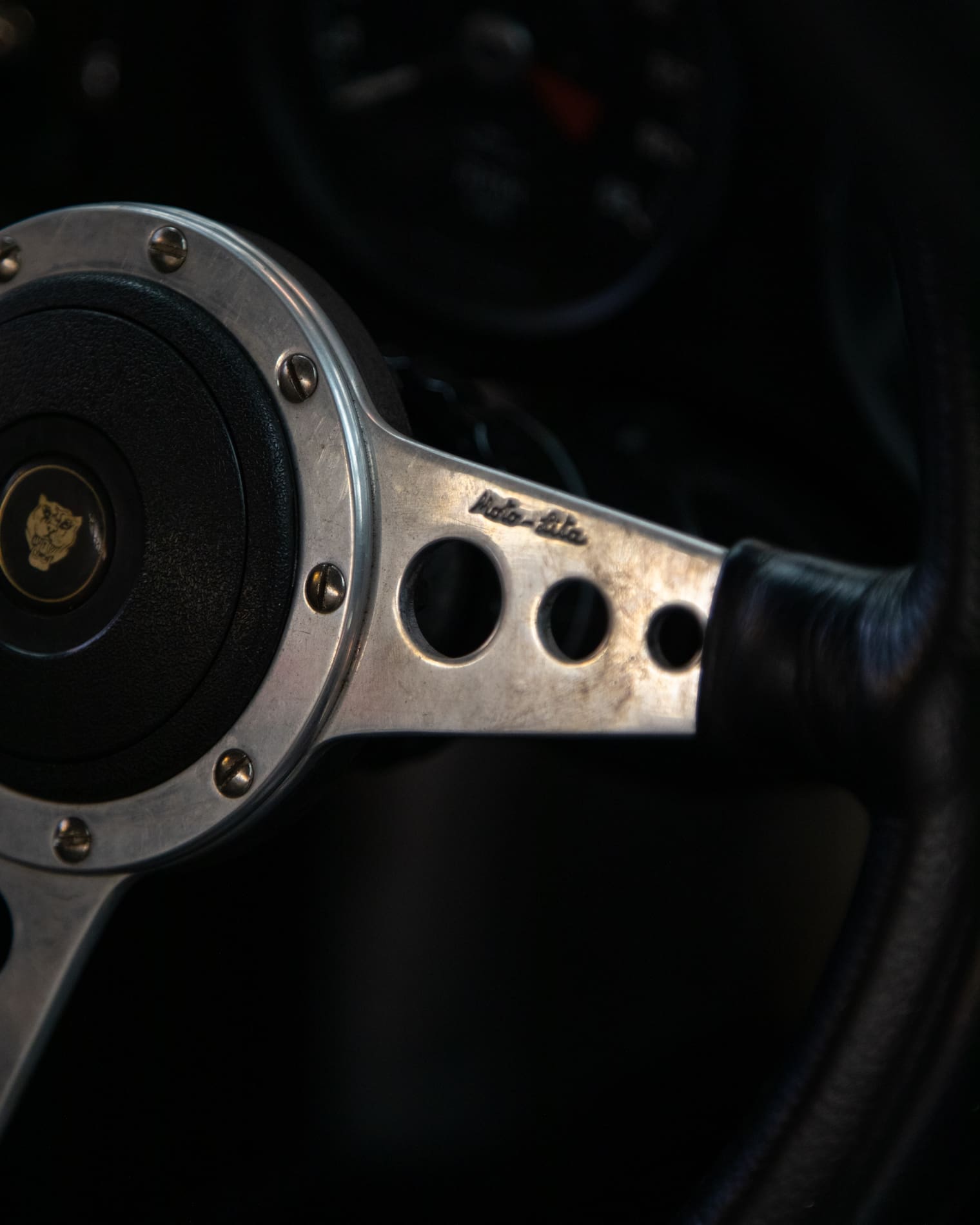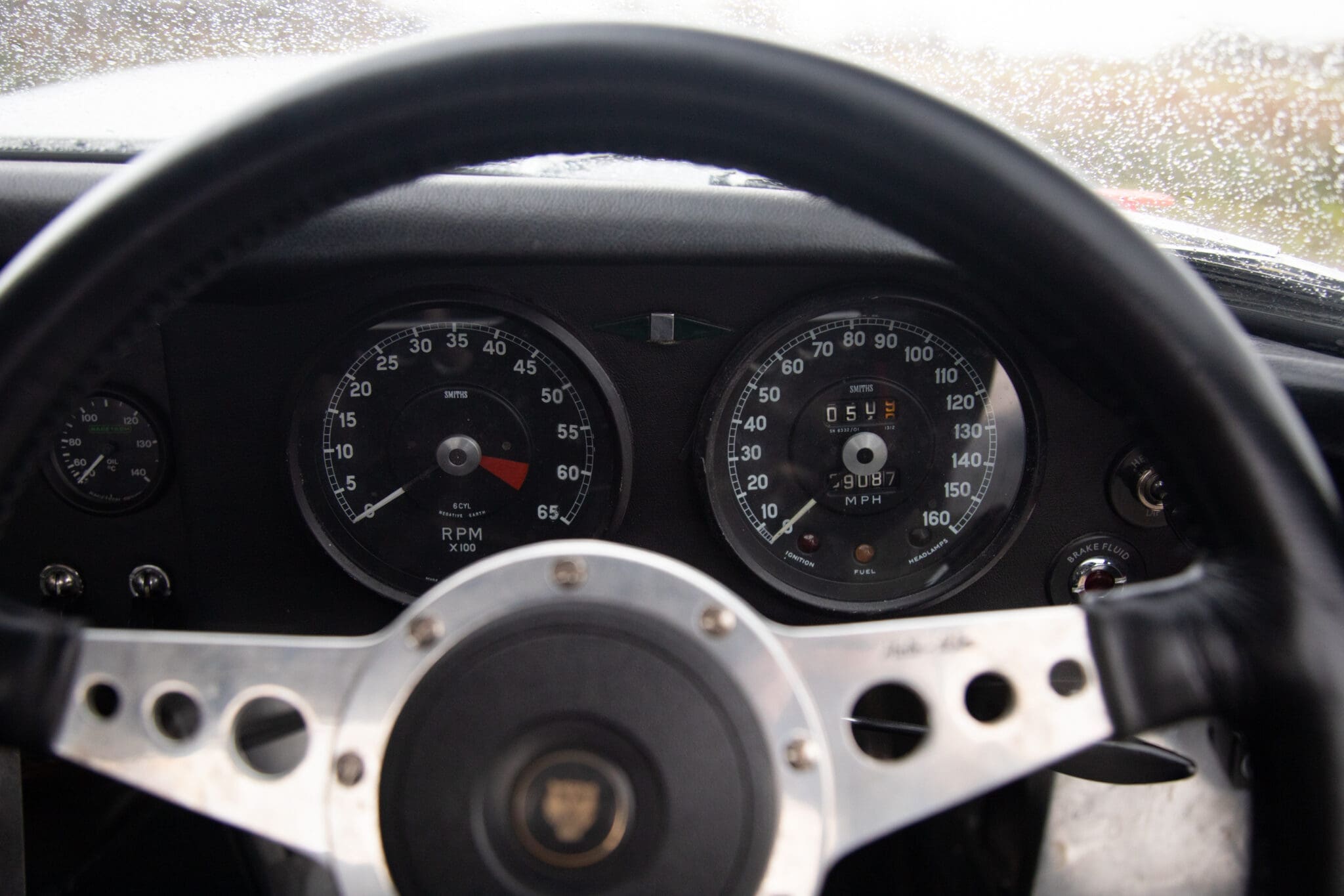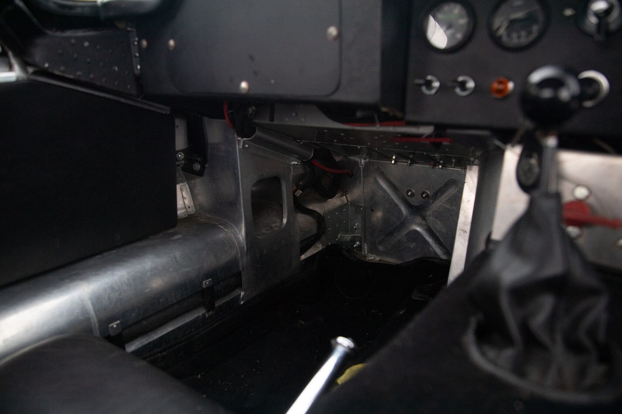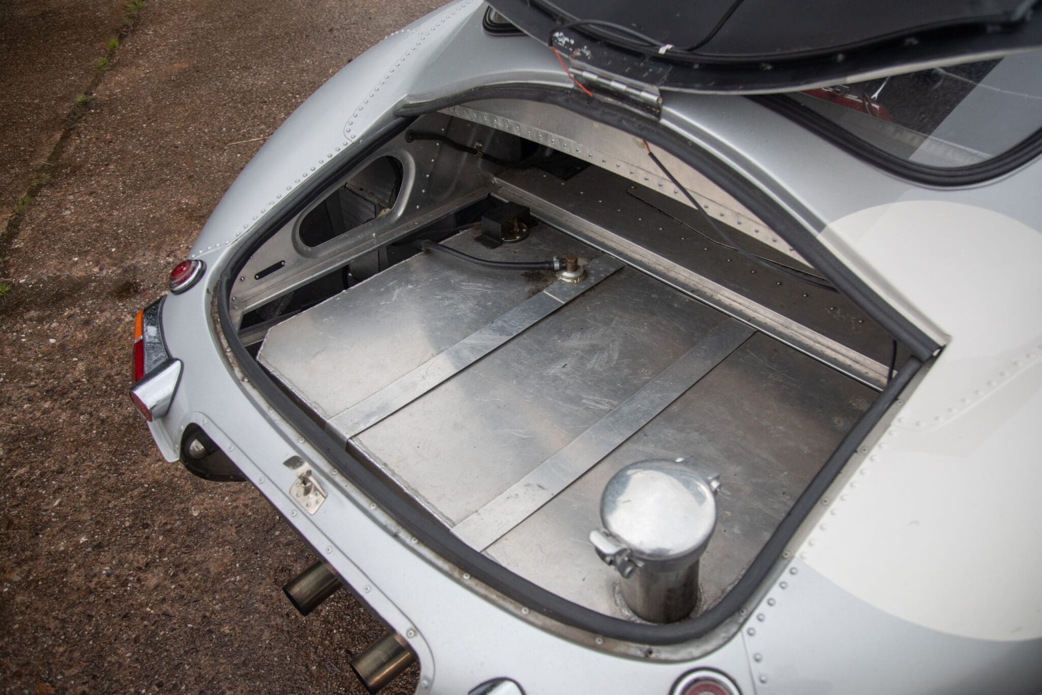The E-type now wears a period Coventry registration number plate ‘5145WK’, very similar to those used by the Works on the factory ‘lightweight’ cars. Interestingly, the original registration number was ‘1258 WK’, when supplied by Henleys of London to a Dr. Burton, confirmed on the accompanying Heritage certificate. Whilst the HTP has now lapsed, the impressive specification still boasts its FIA specification roll cage, plumbed-in fire extinguisher, electrical cut off with internal and external pulls, 8000rpm chronometric tachometer and a removable steering wheel. A long-range fuel tank is installed and the cockpit features two trimmed bucket seats, with four points racing harnesses. The passenger seat hinges forwards to access the rear brakes through the ’trap door’ in the bulkhead. The brakes were uprated, but legal and fully compliant with FIA rulings and the shock absorbers are fully-adjustable Leda units. Riding on magnesium peg-drive wheels, handling is aided with an uprated anti roll bar / subframe.
