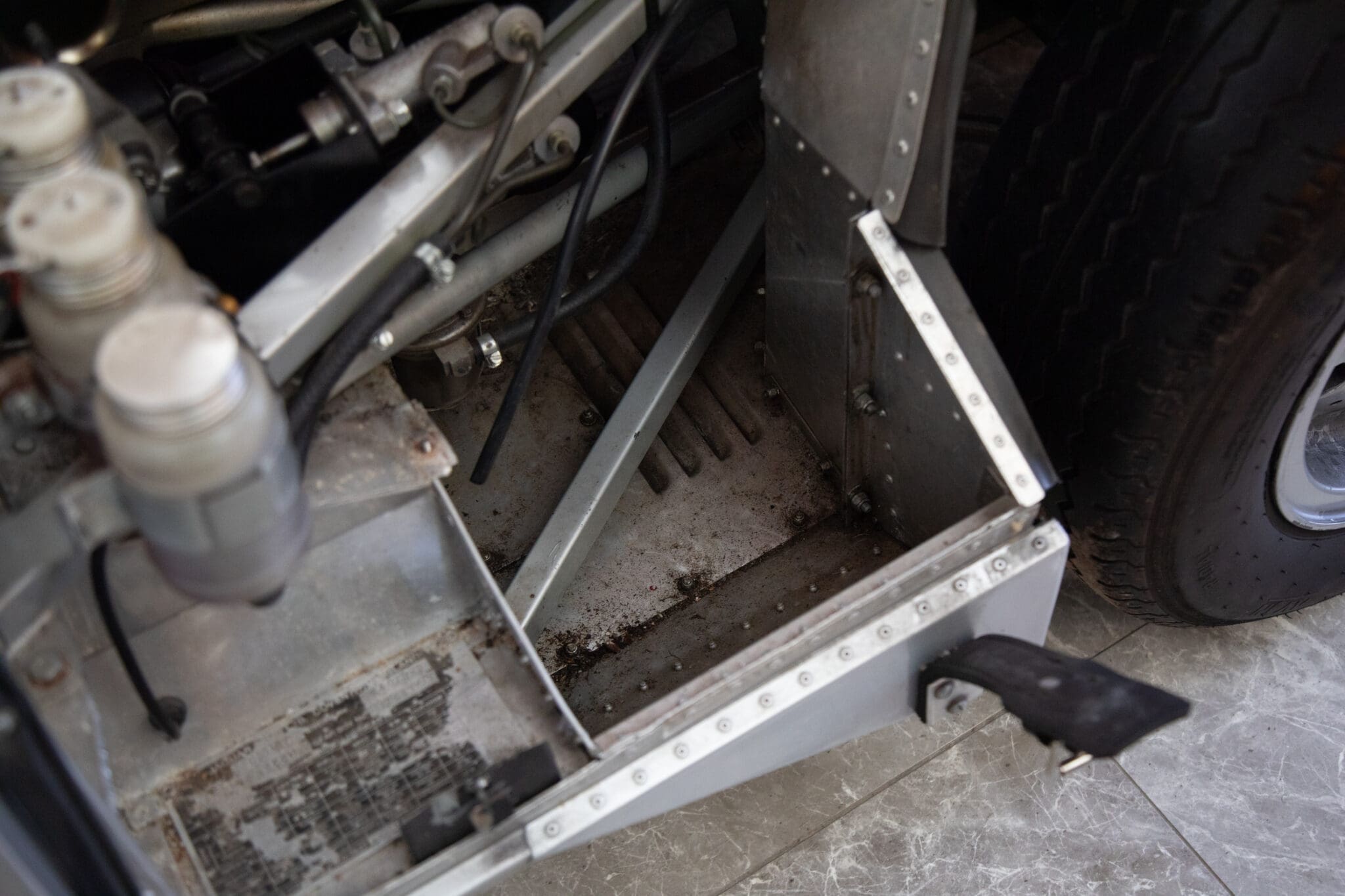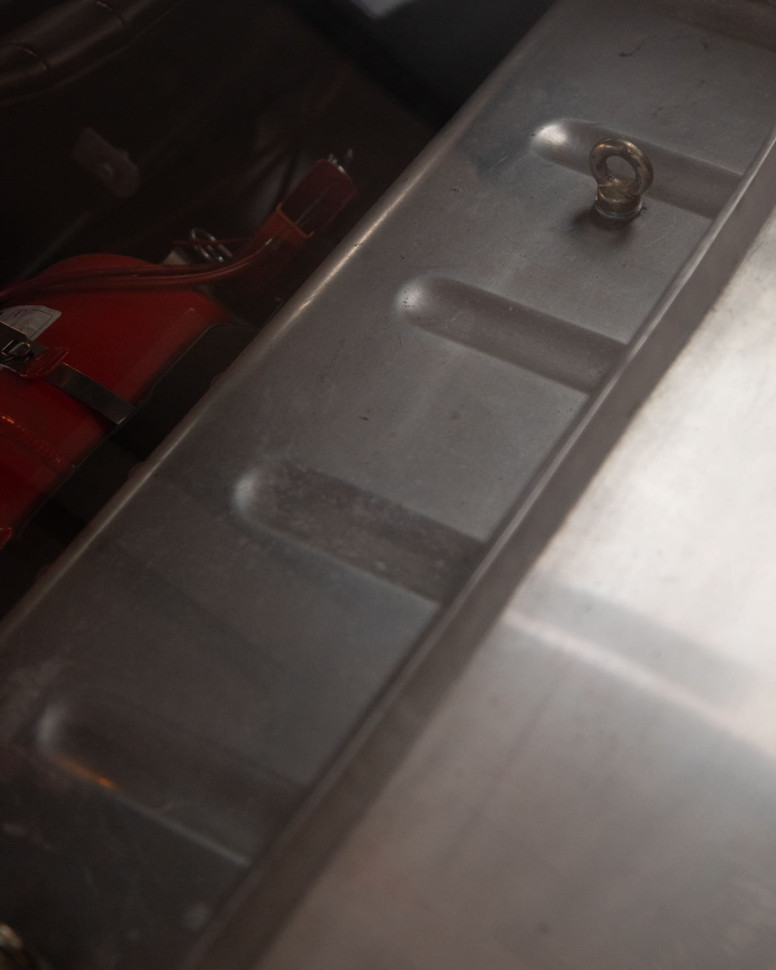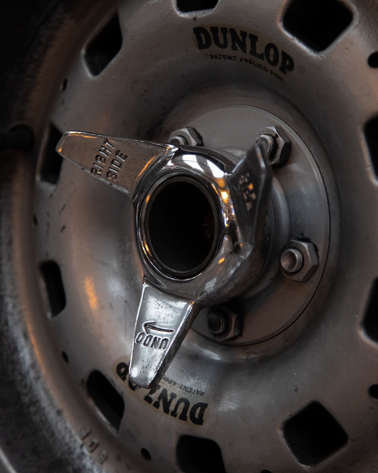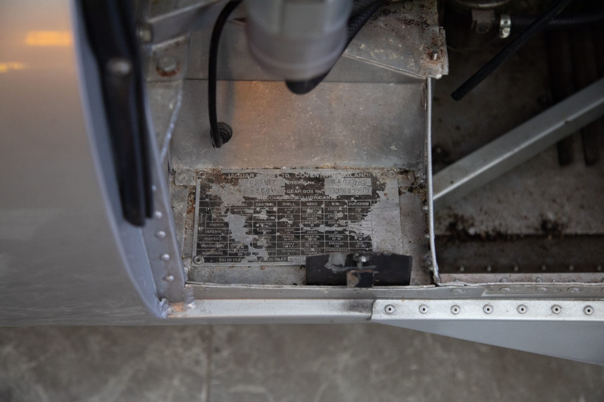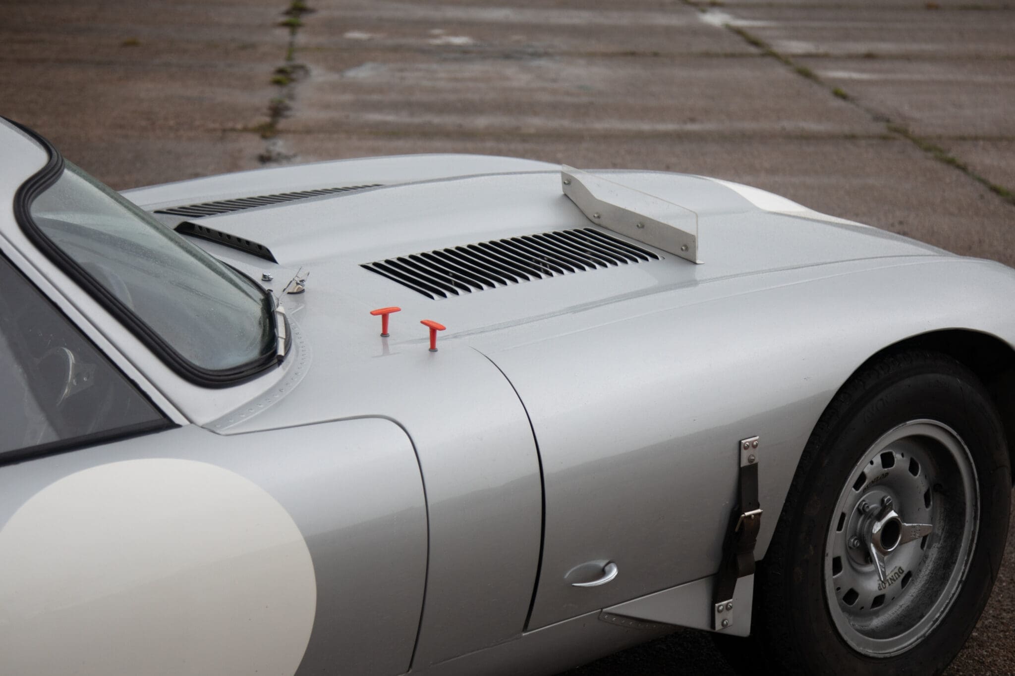 The E-type now wears a period Coventry registration number plate ‘5145WK’, very similar to those used by the Works on the factory ‘lightweight’ cars. Interestingly, the original registration number was ‘1258 WK’, when supplied by Henleys of London to a Dr. Burton, confirmed on the accompanying Heritage certificate. Whilst the HTP has now lapsed, the impressive specification still boasts its FIA specification roll cage, plumbed-in fire extinguisher, electrical cut off with internal and external pulls, 8000rpm chronometric tachometer and a removable steering wheel. A long-range fuel tank is installed and the cockpit features two trimmed bucket seats, with four points racing harnesses. The passenger seat hinges forwards to access the rear brakes through the ’trap door’ in the bulkhead. The brakes were uprated, but legal and fully compliant with FIA rulings and the shock absorbers are fully-adjustable Leda units. Riding on magnesium peg-drive wheels, handling is aided with an uprated anti roll bar / subframe.