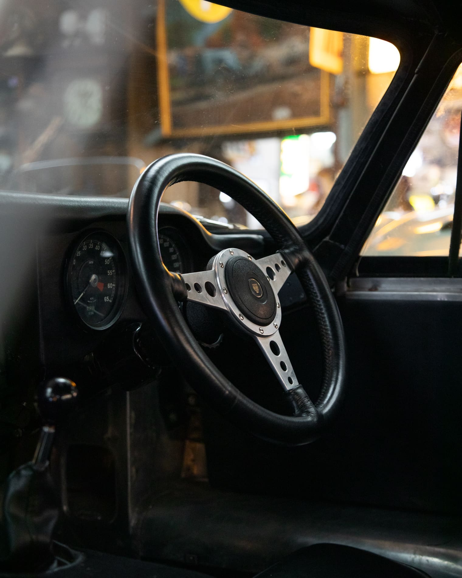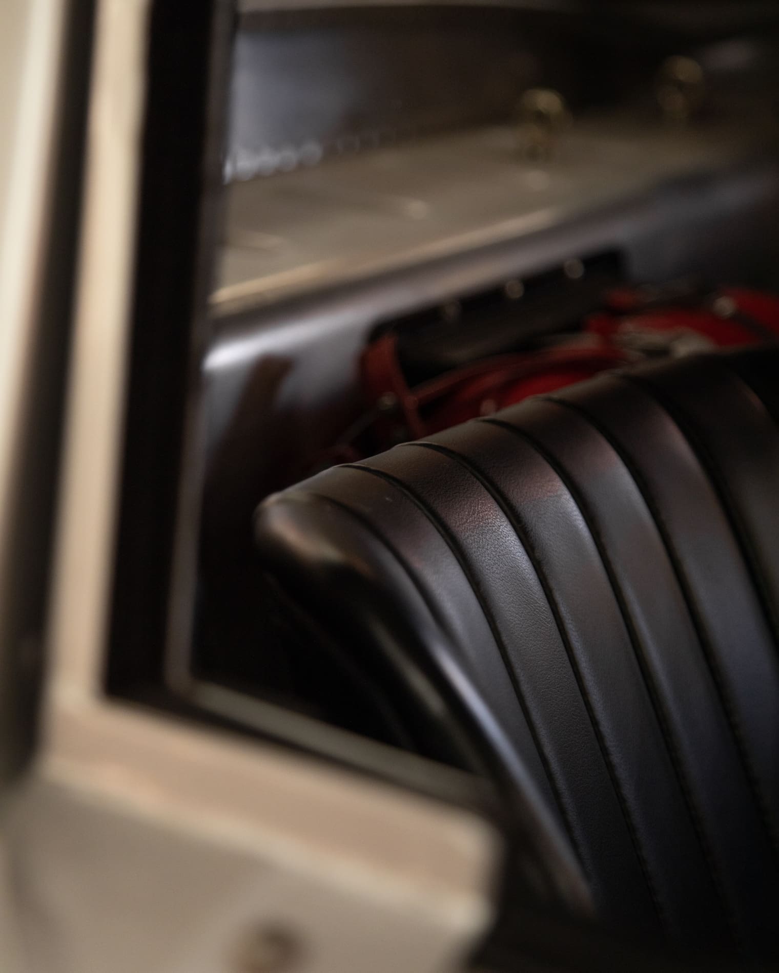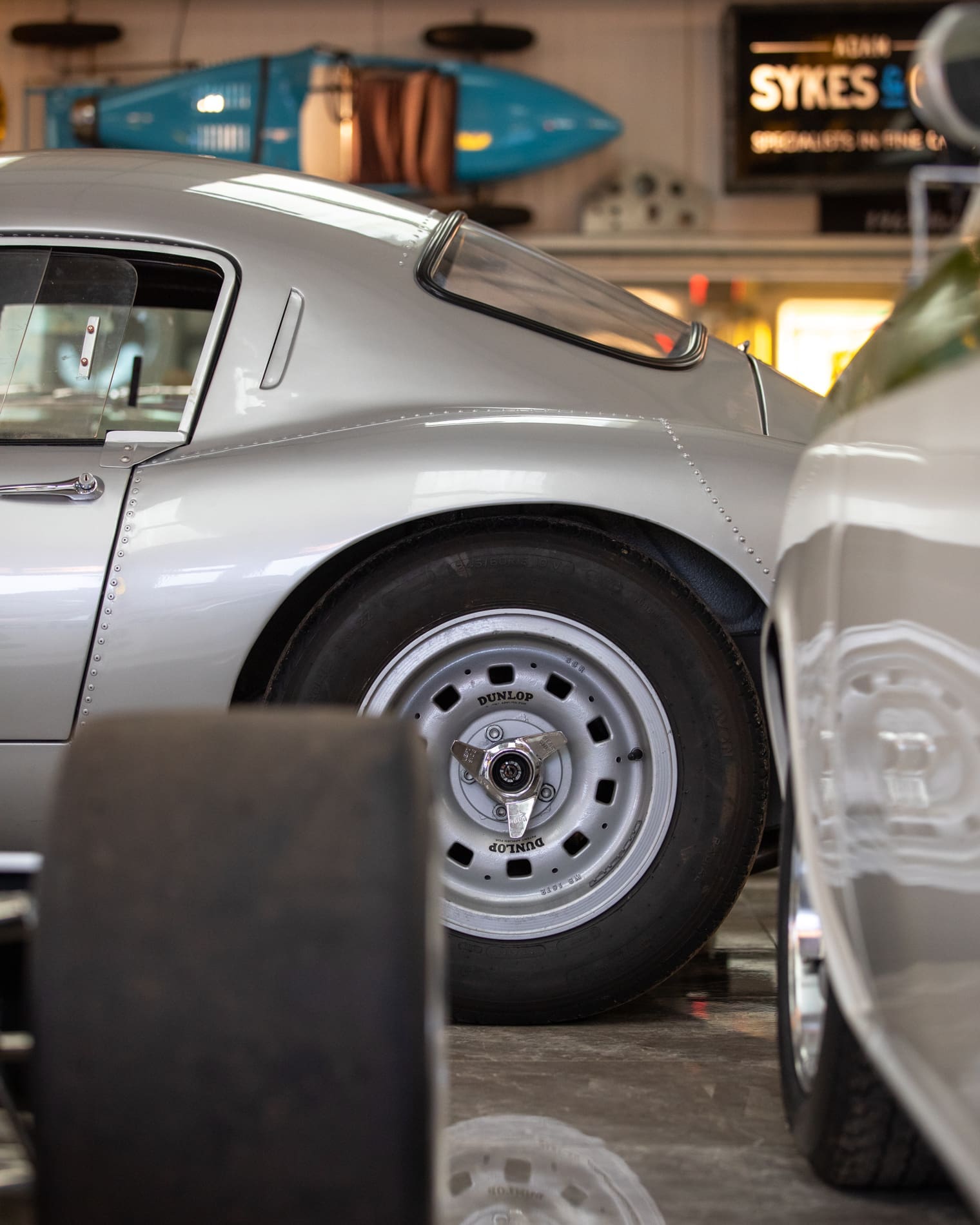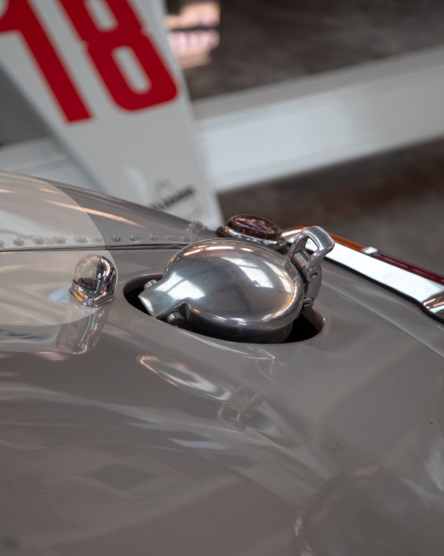 The E-type now wears a period Coventry registration number plate ‘5145WK’, very similar to those used by the Works on the factory ‘lightweight’ cars. Interestingly, the original registration number was ‘1258 WK’, when supplied by Henleys of London to a Dr. Burton, confirmed on the accompanying Heritage certificate. Whilst the HTP has now lapsed, the impressive specification still boasts its FIA specification roll cage, plumbed-in fire extinguisher, electrical cut off with internal and external pulls, 8000rpm chronometric tachometer and a removable steering wheel. A long-range fuel tank is installed and the cockpit features two trimmed bucket seats, with four points racing harnesses. The passenger seat hinges forwards to access the rear brakes through the ’trap door’ in the bulkhead. The brakes were uprated, but legal and fully compliant with FIA rulings and the shock absorbers are fully-adjustable Leda units. Riding on magnesium peg-drive wheels, handling is aided with an uprated anti roll bar / subframe.