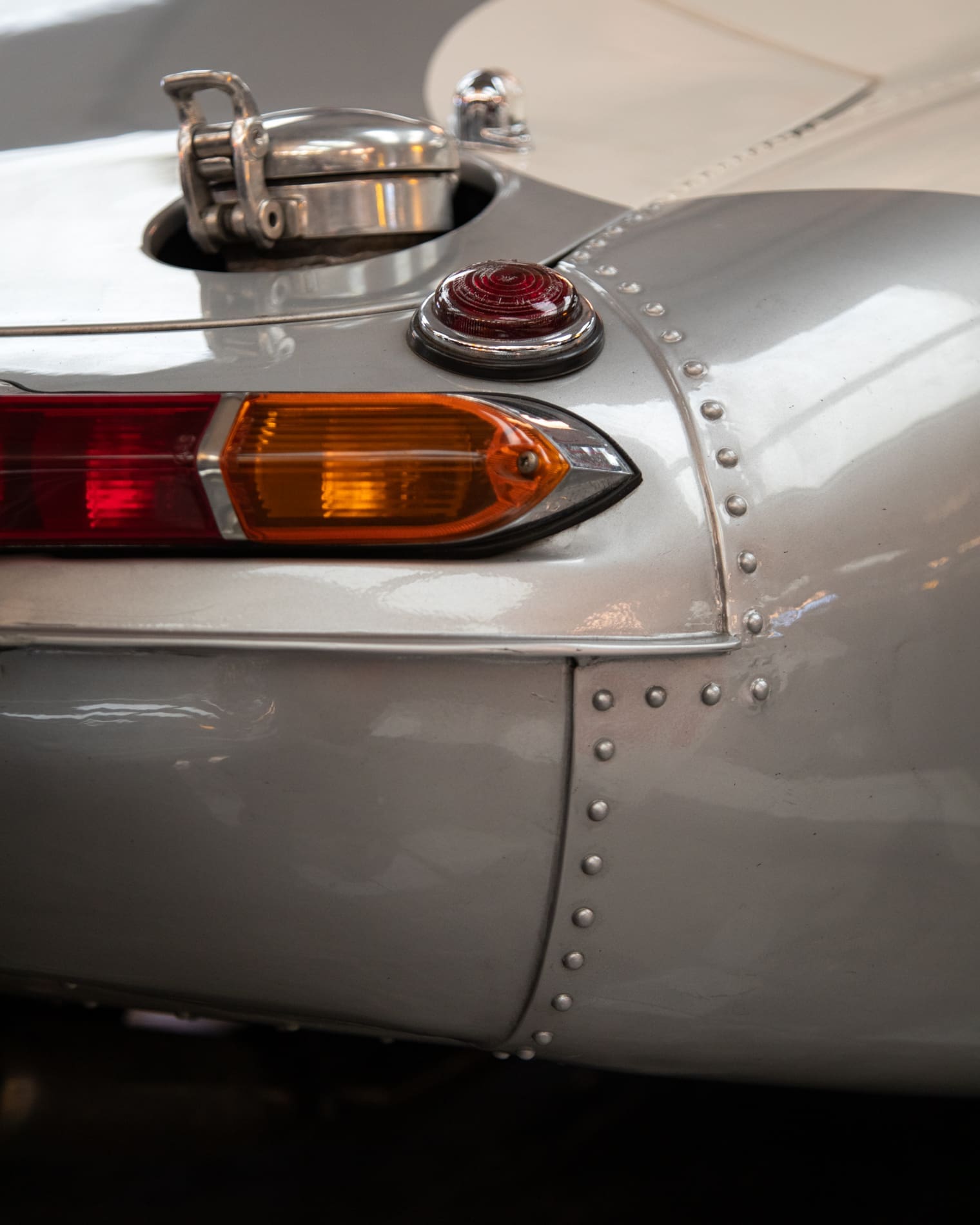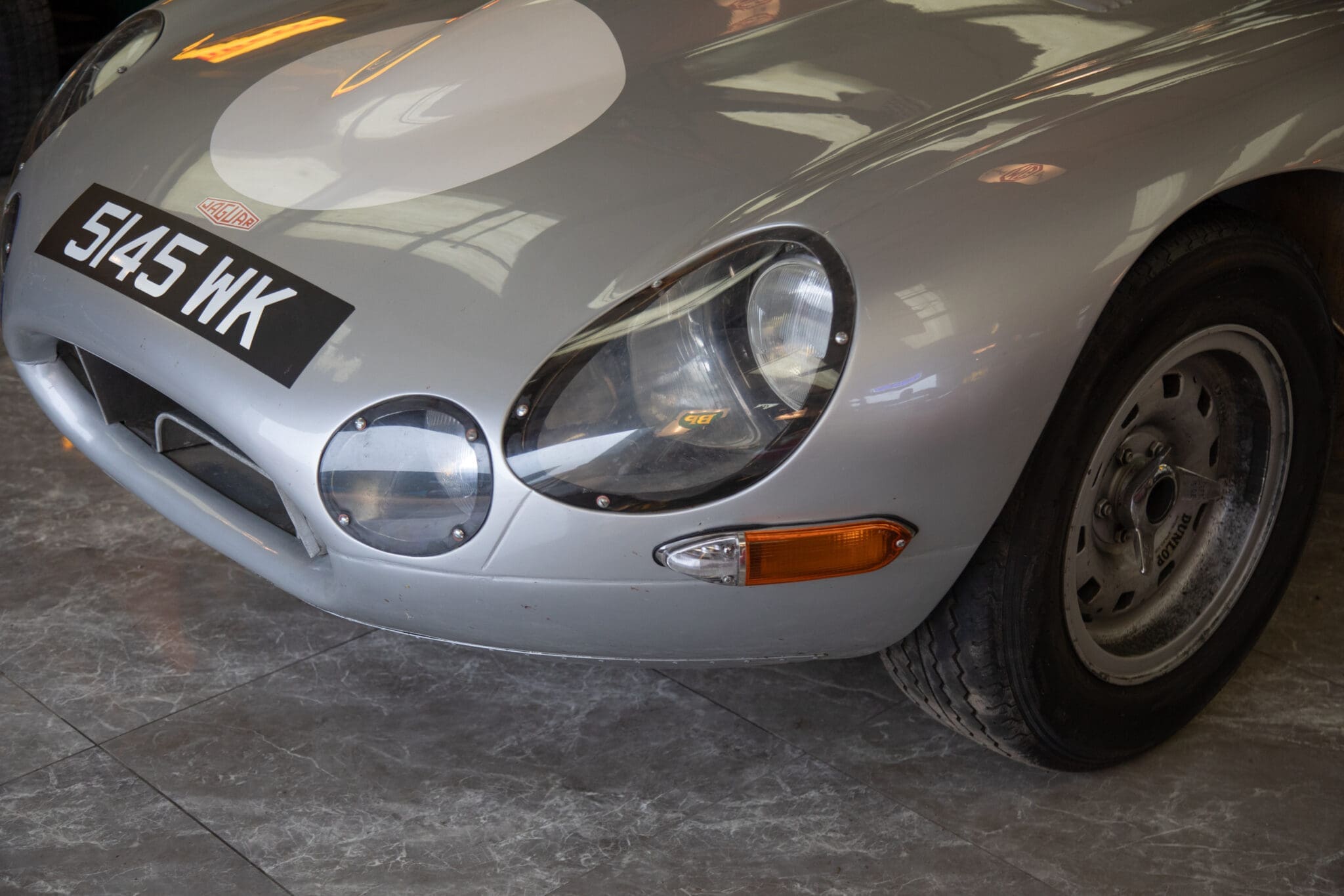 Right from the moment deliveries commenced in 1961, the E-Type began to find its way on to the world’s racetracks. In the Grand Touring class for production sports cars the E-Type proved competitive right from the start, Graham Hill celebrating the model’s racing debut by winning at Oulton Park on 3rd April 1961. The elevation of the GT class to Manufacturers’ Championship status for 1963 prompted Jaguar to develop a small batch of very special lightweight cars to challenge Ferrari. The FIA’s regulations for the Gran Turismo category stipulated that a minimum of 100 cars had to be built, but permitted coachwork modifications, thus enabling Jaguar to claim that its lightweights were standard E-types fitted with altered bodywork. (This is the same loophole exploited by Ferrari to get the limited edition 250 GTO homologated, by claiming that they were re-bodied 250 GTs). In fact, all 12 lightweight E-Types constructed in period were built from scratch with aluminium bodies, though they were invoiced as a new standard road car with additional modifications and numbered in the normal production sequence, albeit with an ‘S’ chassis number prefix!