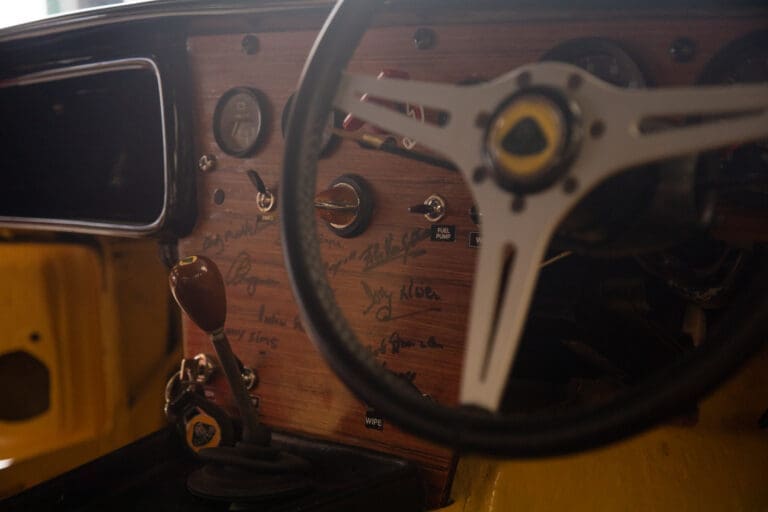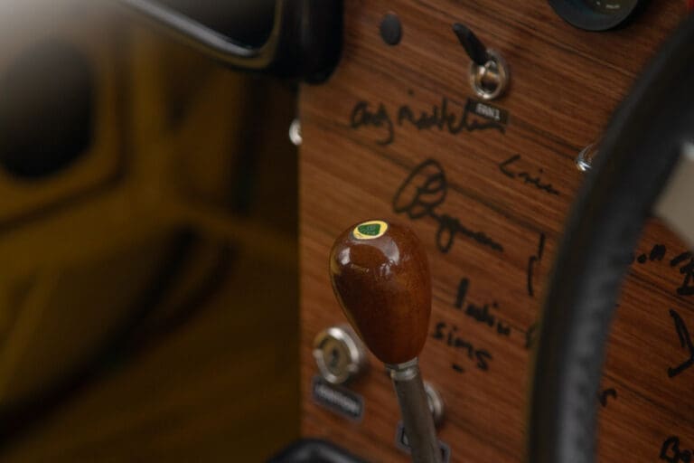 The interior is sparse, yet purposeful and has a roll hoop, leather bucket seats and lots of period-correct features, including gauges rebuilt by Speedograph. The car is fitted with an FIA cut-off switch and lightweight battery meaning track, sprint and hillclimb events are very much a possibility. Other nice touches include the fitment of genuine original Lotus badges, period steering wheel and horn push. The dashboard is a fitting tribute to the Lotus marque with the signatures of many Jim Clark supporters and mechanics, including Bob dance and Clive Chapman.